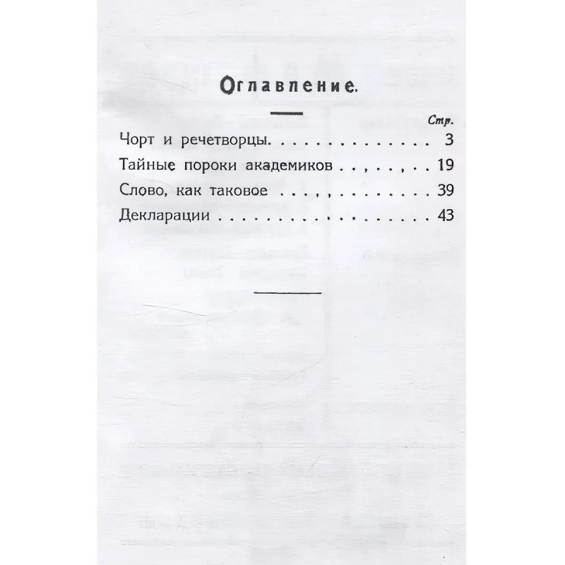 Репринт с издания. Москва, 1923. Переиздание в новых редакциях памфлетов А. Крученых на до-футуристическую литературу ("Чорт и речетворцы", 1913; "Тайные пороки академиков", 1916) и деклараций ("Слово, как таковое", 1913; "Декларация слова, как такового", 1913; "Декларация заумного слова"). Издание Московской Ассоциации Футуристов, серия теории, № 3. Продукция № 122. Содержание: Предисловие; Чорт и речетворцы; Тайные пороки академиков; Сонные свистуны; Зерцог; Философская тройца; Биография луны; Тель (але стиль) литераторов; Из книги "Слово, как таковое"; О художественных произведениях; Декларация слова, как такового; Декларация заумного слова.