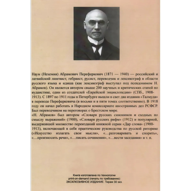 Репринт с издания. СПб., 1910. Глава I. Образование Общества: А. Временная организация. Б. Съезд делегатов. В. Митинг. Г. Образование постоянного общества. Глава II. Предложение кандидатов и выборы. Глава III. Должностные лица (бюро) и их обязанности. Глава IV. Комиссии. Глава V. Кворум. Глава VI. Порядок занятий (Повестка). Глава VII. Поднятие вопросов. Глава VIII. Постановления и Предложения. Глава IX. Вопрос и голосование. Глава X. Получение слова. Глава XI. Прения. Глава XII. Общие советы. Глава XIII. Таблица предложений в порядке первенства и участь их. Наум (Нехемия) Абрамович Переферкович (18711940) российский и латвийский лингвист, гебраист, русист, переводчик и лексикограф в области русского языка и идиша (как лексикограф выступал под псевдонимом Н. Абрамов). Он является автором свыше 200 научных и критических статей по иудаистике, один из создателей "Еврейской энциклопедии" (СПб., 19081913). С 1897 по 1911 годы в Петербурге вышли в свет два издания "Талмуда" в переводе Переферковича (в восьми и в пяти томах соответственно). В 1918 году он начал работать в Народном комиссариате иностранных дел РСФСР. Был переводчиком на переговорах о Брестском мире. "Н. Абрамов" был автором "Словаря русских синонимов и сходных по смыслу выражений" (1900), "Словаря русских рифм" (1912) и популярной, выдержавшей множество переизданий книжной серии "Дар слова" (19001913), включающей в себя практические руководства по русской риторике ("Искусство излагать свои мысли", "... разговаривать и спорить", "... произносить речи", "... писать сочинения", "... вести заседания" и т. п. раж 30 экз. выполнен по технологии print-on-demand.