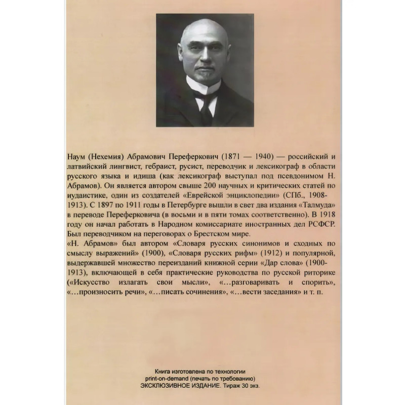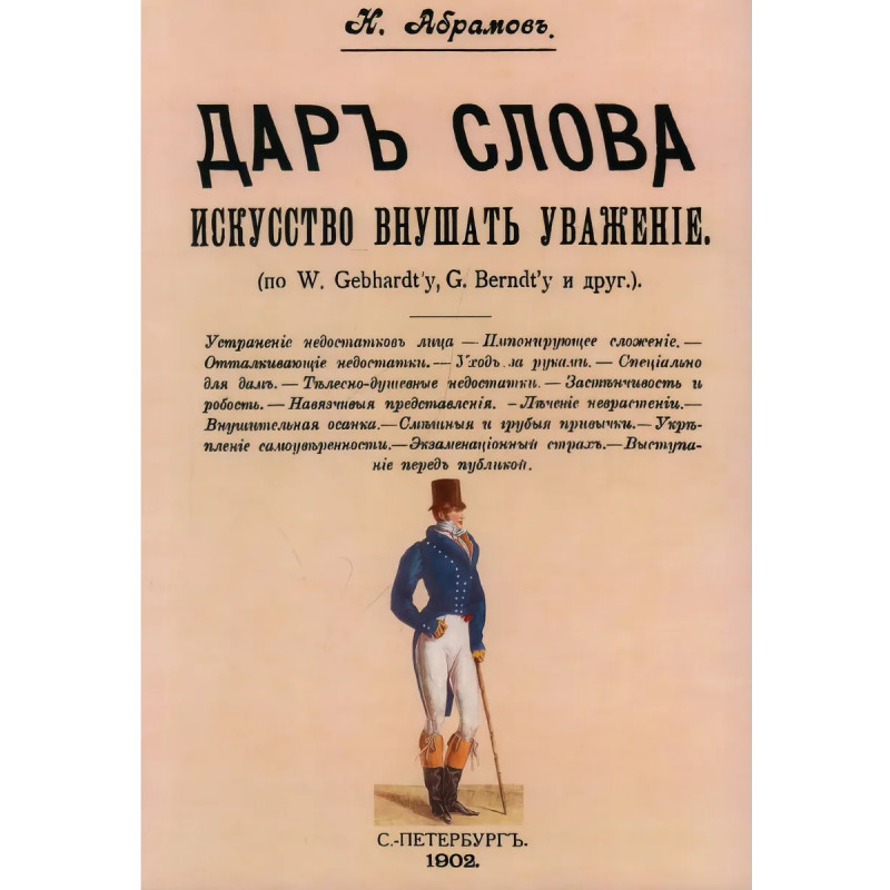 Репринт с издания. СПб., 1902. Устранение недостатков лица. Импонирующее сложение. Отталкивающие недостатки. Уход за руками. Специально для дам. Телесно-душевные недостатки. Застенчивость и робость. Навязчивые представления. Лечение неврастении. Внушительная осанка Смешные и грубые привычки. Укрепление самоуверенности. Экзаменационный страх. Выступание перед публикой (по W. Gebhardt'y, G Berndt'y и друг.). Наум (Нехемия) Абрамович Переферкович (18711940) российский и латвийский лингвист, гебраист, русист, переводчик и лексикограф в области русского языка и идиша (как лексикограф выступал под псевдонимом Н. Абрамов). Он является автором свыше 200 научных и критических статей по иудаистике, один из создателей "Еврейской энциклопедии" (СПб., 19081913). С 1897 по 1911 годы в Петербурге вышли в свет два издания "Талмуда" в переводе Переферковича (в восьми и в пяти томах соответственно). В 1918 году он начал работать в Народном комиссариате иностранных дел РСФСР. Был переводчиком на переговорах о Брестском мире. "Н. Абрамов" был автором "Словаря русских синонимов и сходных по смыслу выражений" (1900), "Словаря русских рифм" (1912) и популярной, выдержавшей множество переизданий книжной серии "Дар слова" (19001913), включающей в себя практические руководства по русской риторике ("Искусство излагать свои мысли", "... разговаривать и спорить", "... произносить речи", "... писать сочинения", "... вести заседания" и т. п.