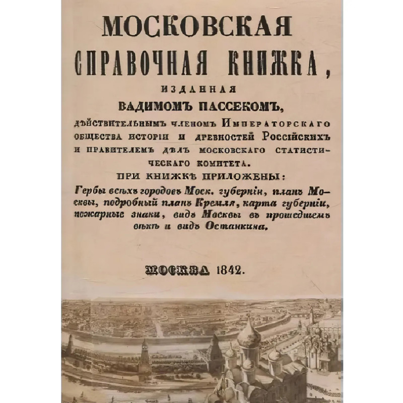 Московская справочная книжка, изданная Вадимом Пассеком, действительным членом Общества истории и древностей российских и правителем дел Московского статистического комитета. С цветными планами Столичного города Москвы и планом Московского Кремля.