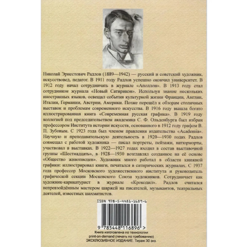 Николай Эрнестович Ра?длов (18891942) русский и советский художник, искусствовед, педагог. Лауреат Сталинской премии второй степени (1942) за политические плакаты и карикатуры в "Окнах ТАСС". В 1919 году избран профессором Института истории искусств, основанного в 1912 году графом В. П. Зубовым. В течение ряда лет Радлов был проректором, учёным секретарём института, председателем секции общей теории и методологии искусства, читал лекции и выступал с докладами по западноевропейскому искусству XIX века. В 1921 году Радлов начал преподавать рисование в Академии художеств и в должности профессора работал там с перерывами до своего переезда в Москву в 1937 году. С 1923 года был членом правления издательства "Academia". Научную и преподавательскую деятельность в 19201930 годах Радлов совмещал с работой художника пишет портреты, пейзажи, натюрморты, участвует в выставках. В 1922-1927 годах входит в состав выставочной группы "Шестнадцать". В 1928-1930 возвглавлял созданное на ее основе "Общество живописцев". Художник много работал в области книжной графики: , иллюстрировал книги, печатался в сатирических журналах. С 1937 года профессор Московского художественного института и руководитель графической секции Московского союза художников. Сотрудничает как художник-карикатурист в журнале "Крокодил". Радлов считался непревзойденным мастером шаржей на писателей, музыкантов, театральных деятелей, известных шахматистов.