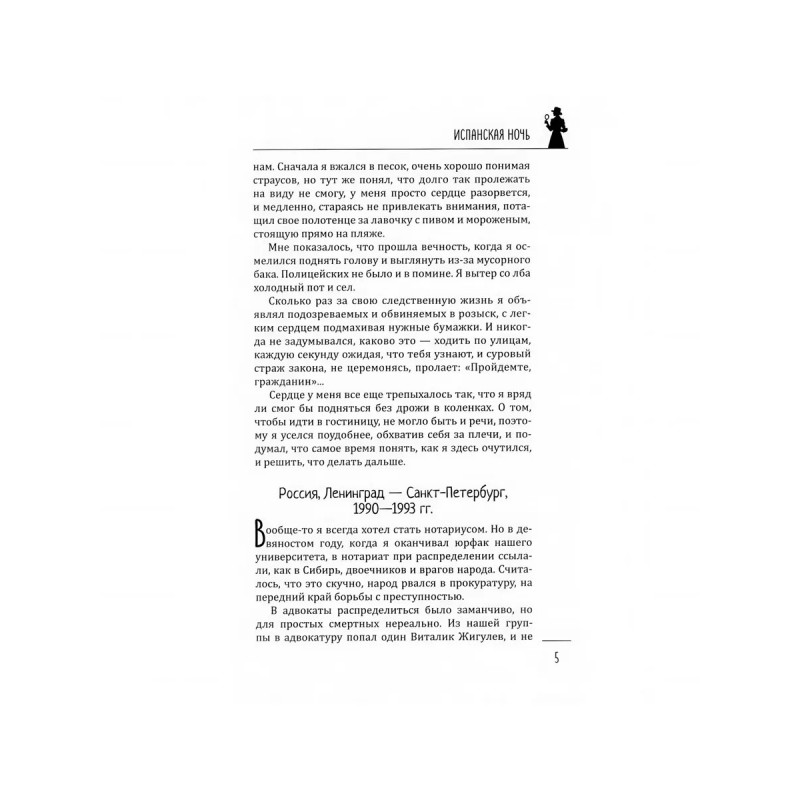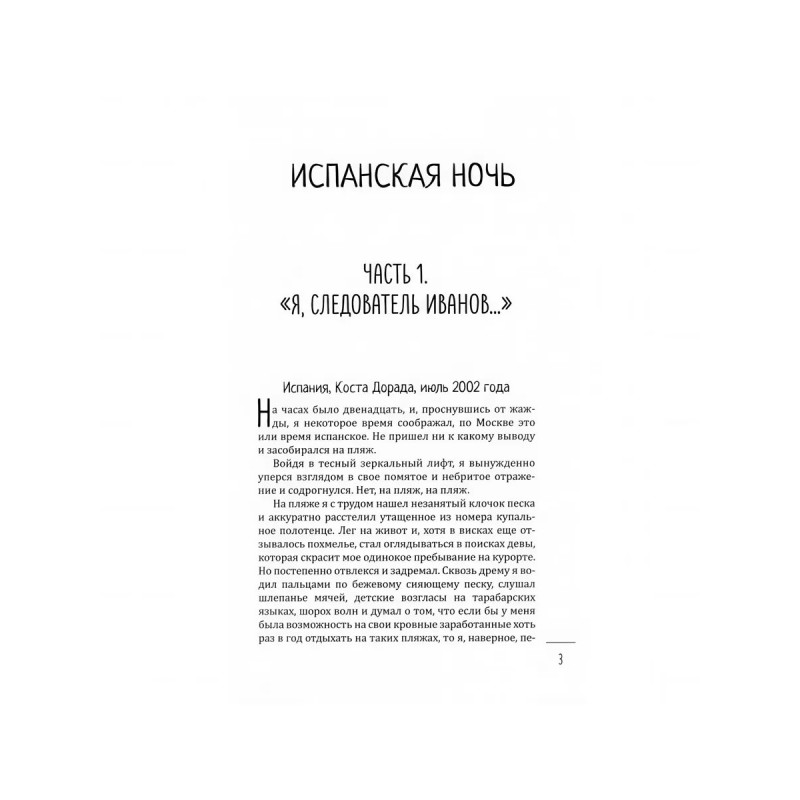 В книгу вошли два остросюжетных романа с разными героями, разным местом действия и особой детективной интригой, но объединенные тем, как глубоко и изощренно прошлое проникает в настоящее и даже будущее. Первый из них "Испанская ночь" о том, как в середине XX века крохотным европейским государством Андоррой недолго правил русский эмигрант и этот исторический факт странным образом вмешался в жизнь наших современников. Коррупция, международный авантюризм, тайны внешней разведки все это сплелось в тугой узел, в центре которого оказался рядовой следователь Михаил Иванов. Еще вчера он спокойно расследовал дела об экономических преступлениях в Санкт-Петербурге, а сегодня ему предстоит в одиночку в чужой стране найти похищенную невесту испанского тореадора и уйти от преследования мафии. Что общего между таинственным правителем Андорры и следователем Ивановым? У них один враг... Во втором "Дверь в зеркало" молодой следователь Антон Корсаков боится признаться, что в старинном зеркале на месте происшествия видел призрак женщины. Но оказывается, что не ему одному являлась эта таинственная незнакомка, и те, кто ее видел, погибают. Корсаков и не подозревает, что зловещая дама, старое зеркало и загадочные смерти тесно связаны с историей его собственной семьи. И никакой мистики...