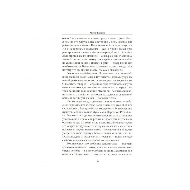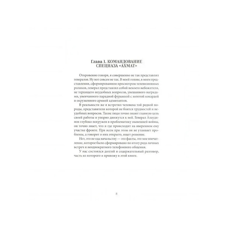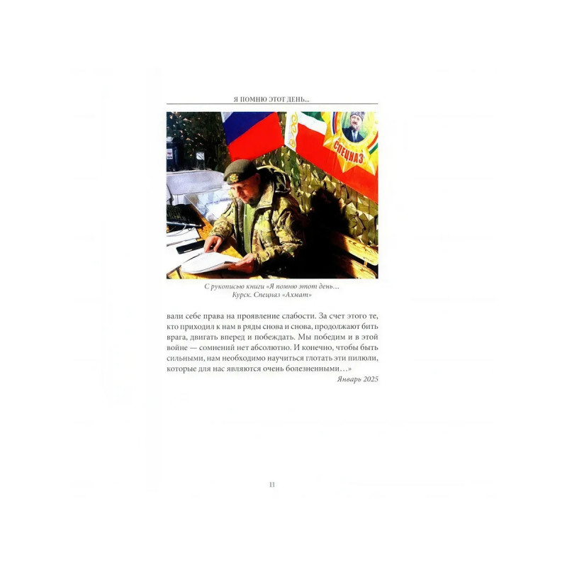 Создание этой книги началось в январе 2025 года, когда Спецназ "Ахмат" противостоял постоянным атакам противника на суджанском направлении (Курская область). Заканчивал свою книгу я уже под Белгородом, куда бойцов "Ахмата" перекинули выбивать противника, вновь прорвавшегося на территорию России. За это время я обрел настоящих друзей боевых братьев. Отдельную благодарность я хочу выразить товарищу "Архангелу", который помогал в сборе материала и предоставил уникальную возможность пообщаться со всеми бойцами, а также товарищу "Хохлу", батальон которого приютил нас с военкором "Мехом" у себя. Хочу сказать спасибо проекту DKCHV x KSANTI за серию профессиональных фотографий бойцов Спецназа "Ахмат", вошедших в книгу. Товарищу "Меху" без него точно ничего бы не получилось. Он всегда и везде был со мной, имея неиллюзорный шанс навечно остаться на полях брани. Ну и главное спасибо ВСЕМ бойцам Спецназа "Ахмат" за их ратную работу по освобождению Русской земли от вражеских полчищ!