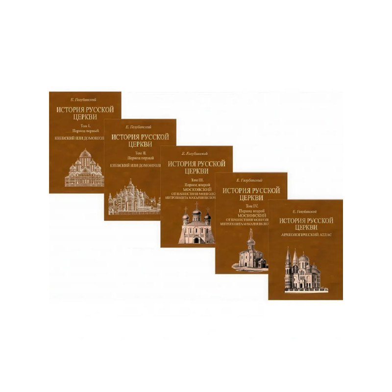 Репринт с издания. Москва, 1901-1911 гг. В 5 переплетах. Содержание: Период Киевский или Домонгольский; Археологический атлас ко второй половине 1 тома (другого не было); Период второй, Московский. От нашествия монголов до Митрополита Макария включительно. Репринт 1901 г. Незаконченный труд Голубинского История Русской Церкви занимает особое место в историографии Русской Церкви. Каждый том содержит дополнительные материалы о русской богослужебной жизни, духовном просвещении, об отношении к инославным и др., в основе которых лежат рукописные тексты. Голубинский первым широко использовал византийские и западноевропейские сочинения. Историк подверг критическому анализу источники и многие общепризнанные факты, особенно относящиеся к начальной истории Русской Церкви, объявил сомнительными. Евгений Евсигнеевич Голубинский (18341912) историк Русской Церкви и церковной архитектуры. Ординарный академик Императорской академии наук по отделению русского языка и словесности (1903). Считается сторонником позитивизма. Он сыграл важную роль в канонизации преподобного Серафима Саровского. Автор книги "История канонизации святых в русской церкви".
