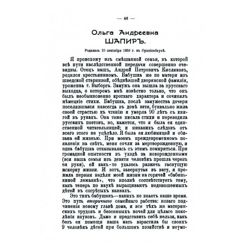 Репринт с издания. Москва, 1911. Сборник 54 автобиографий знакомых Фидлера (Ответы на 25 вопросов его опросника.) Фёдор Фёдорович Фидлер, немецкое имя Фридрих Людвиг Конрад Фидлер (1859 1917) переводчик (в основном, русской поэзии на немецкий язык), педагог и собиратель частного литературного музея, посвященного литераторам России и Германии, автор дневника хроники жизни литераторов. Фидлер был активнейшим участником литературной жизни Петербурга на протяжении 30 лет, одним из непременных членов кружка Вечера Случевского, участвовал во всех литературных обществах Петербурга (многие возникли по его инициативе), юбилеях литературной деятельности и пр. Создатель литературного клуба Товарищеские обеды. Среди знакомых Фидлера сотни литераторов самого разного уровня и направления, от классиков до явно третьестепенных фигур. Автобиографии: Лазаревский, Б. А.; Авенариус, В. П.; Петров, Гр. Сп.; Андреев, Л. Н.; Измайлов, А. А.; Тихонов, В. А.; Чнрнков, Е. Н.; Шапир, О. А.; Лукашевич, К. В.; Потапенко, И. Н.; Щепкина-Куперник, Т. Л.; Морозов, Н. А.; Луговой, А. А.; Блок, А. А.; Рукавишннков, И. С.; Соловьева, П. С. (Allegro).; Щеглов, И. Л.; Федоров, А. М.; Косоротов, А. И.; Черниговец-Вишневский, Ф. В.; Муйжель, В. В.; Гусев-Оренбургский, С. И.; Чулков, Г. И.; Томашевская, В. И.; Ратгауз, Д. М.; Дымов, О. И.; Будищев, А. Н.; Овсянико-Куликовский, Д. Н.; Сергеенко, П, А.; Светлов, В. Я.; Галнна, Г. А.; Арсеньев, К. К.; Пантелеев, Л. Ф.; Дрожжин, С. Д.; Баранцевич, К. С.; Волошин, М. А.; Туношенский, В. В.; Аннепский. И. Ф.; Шестов, Л. И.; Альбов, М. И.; Гурович, Л. Я.; Ясинский, И. И.; Тэффи, Н. А.; Пружанский, Н. О.; Засодимский, Н. В. Зарин, Л. Е.; Ромизов, Л. М.; Карпов, Е. П.; Безнятов, Е. М.; Белоусов, И. А.; Хирьяков, Л. М.; Цензор, Д. М.; Гриневская, И. А.; Бунин, И. А.