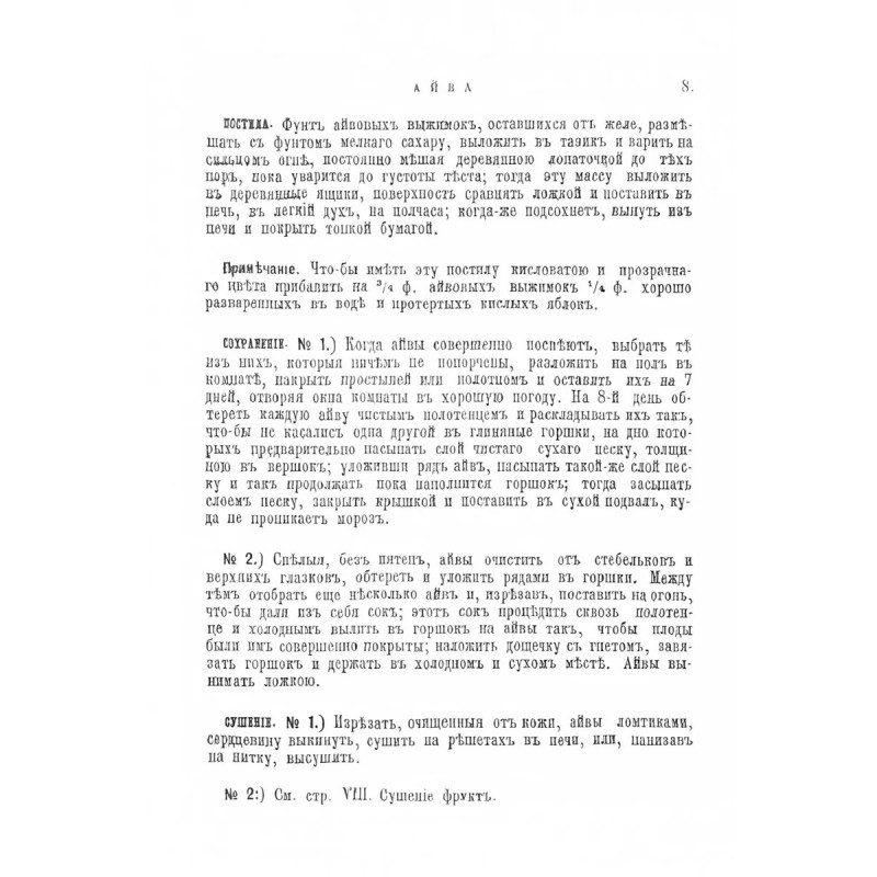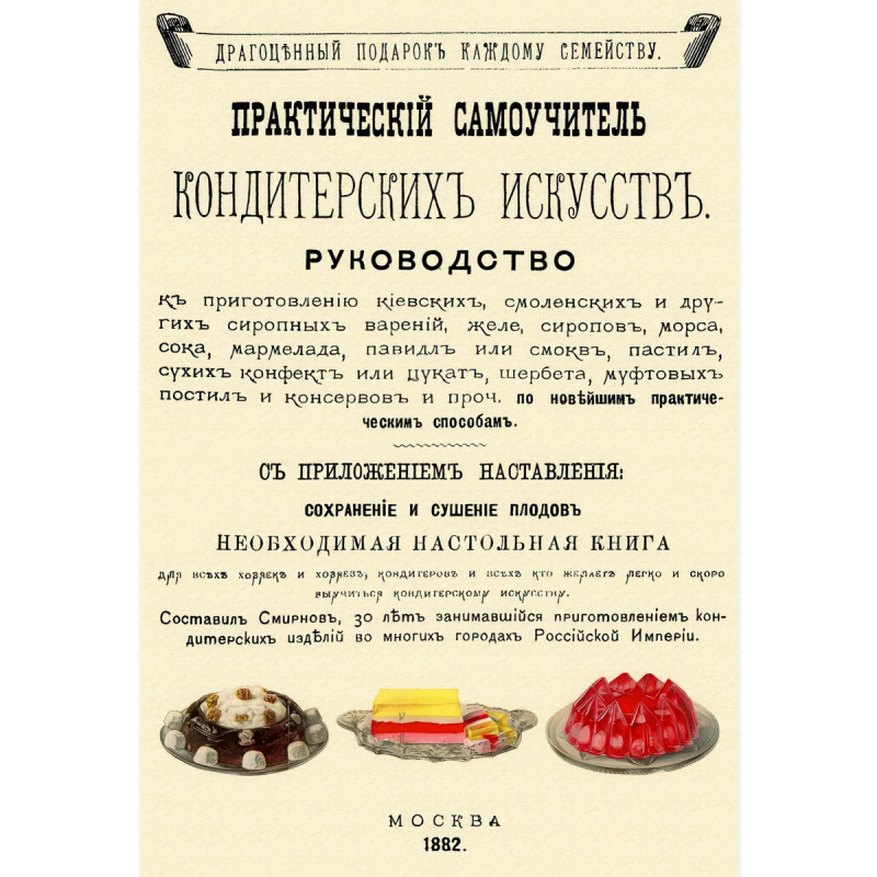 Репринт с издания. Москва 1882. Руководство к приготовлению киевских, смоленских и других сиропных варений, желе, сиропов, морса, сока, мармелада, повидла или смокв, пастилы, сухих конфект или цукат, шербета, муфтовых пастил и консервов и проч. по новейшим практическим способам. С приложением наставления: сохранение и сушение плодов. Необходимая настольная книга для всех хозяев и хозяек, кондитеров и всех, кто желает легко и скоро научиться кондитерскому искусству. Составил Смирнов, 30 лет занимавшийся приготовлением кондитерских изделий во многих городах Российской Империи. Вышла под грифом Драгоценный подарок каждому семейству, эта книга и в наше время пригодится настоящим хозяевам и хозяйкам, любящим готовить, а также кондитерам-профессионалам.