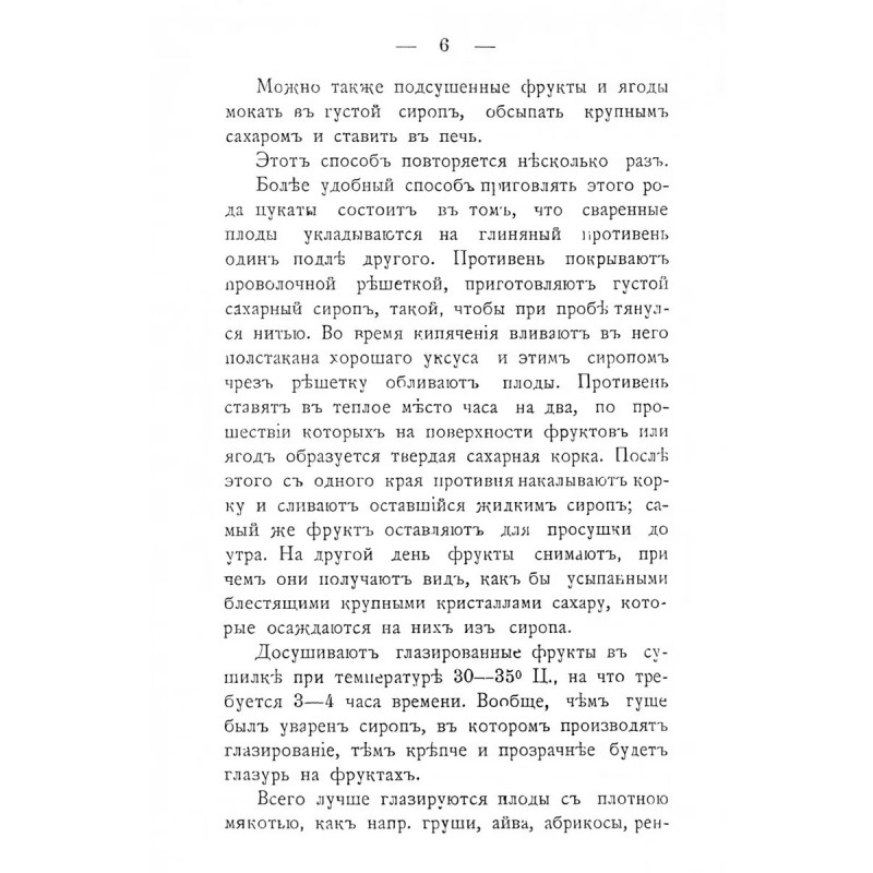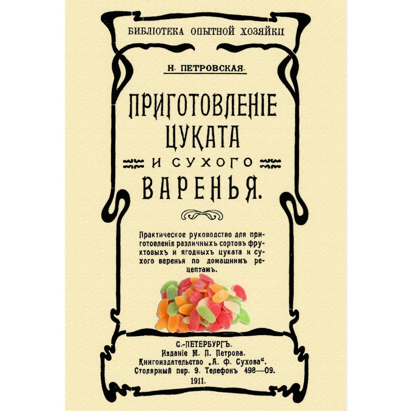 Репринт с издания. 1911. 41 рецепт. Практическое руководство для приготовления различных сортов фруктовых и ягодных цуката и сухого варенья по домашним рецептам. Тираж 30 экз. выполнен по технологии print-on-demand.