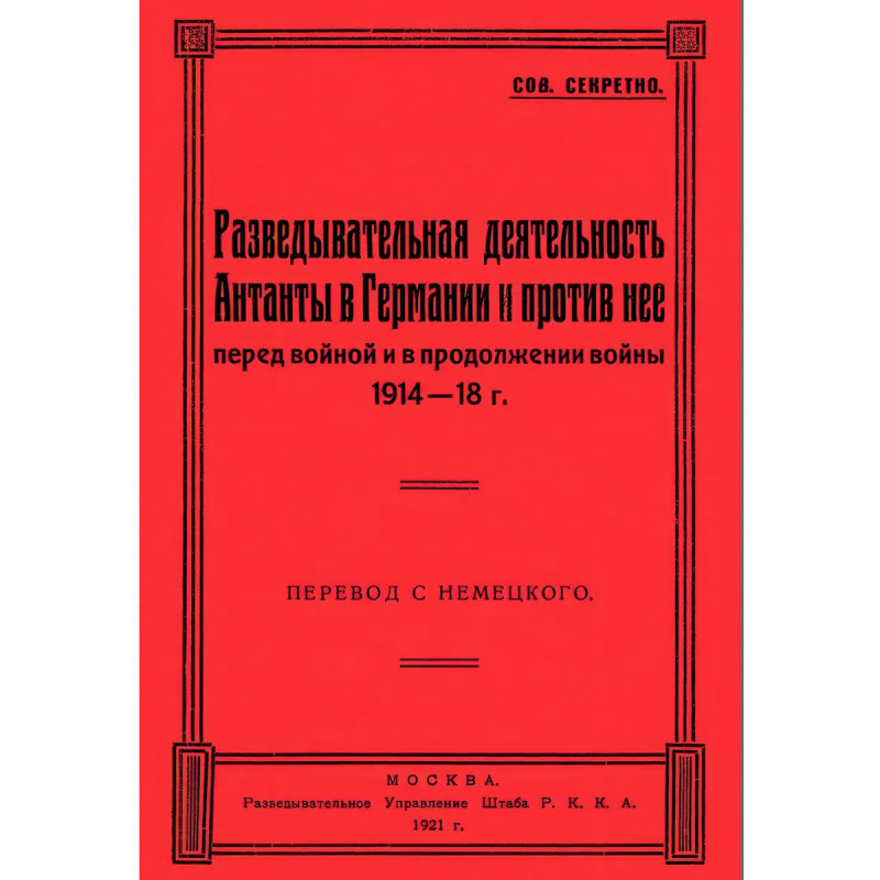 Репринт с издания. Москва, 1921. Книга дает картину разведки главнейших государств Антанты в Германии до войны и во время войны на основании документов Разведывательного отделения 3 отдела Большого Генерального Штаба Германии. Переведено с немецкого для Разведывательного Управления Штаба Р. К. К. А. В книге много фактических материалов не освещенных до сегодняшнего дня в печати. Приведены конкретные разведывательные операции союзниками против Германии. Тираж 30 экз. выполнен по технологии print-on-demand.