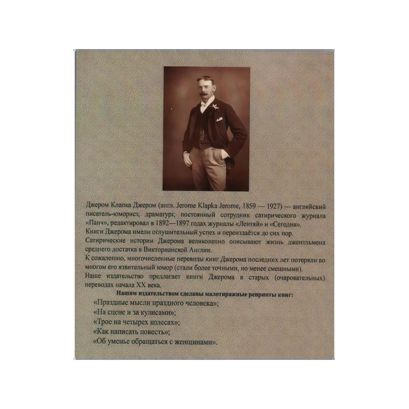 Продолжение Трое в лодке, не считая собаки с теми же героями. На этот раз Джей, Джордж и Гаррис путешествуют на велосипедах по Германии. Перевод Н. Жаринцевой. Джером Клапка Джером (1859 1927) английский писатель-юморист, драматург, постоянный сотрудник сатирического журнала Панч. Книги Джерома имели оглушительный успех и переиздаются до сих пор. Сатирические истории Джерома великолепно описывают жизнь джентльмена среднего достатка в Викторианской Англии. К сожалению, многочисленные переводы книг Джерома последних лет потеряли во многом его язвительный юмор (стали более точными, но менее смешными). Наше издательство предлагает книги Джерома в старых (очаровательных) переводах начала XX века. Нашим издательством сделаны малотиражные репринты книг: Праздные мысли праздного человека; На сцене и за кулисами; Как написать повесть; Об уменье обращаться с женщинами.