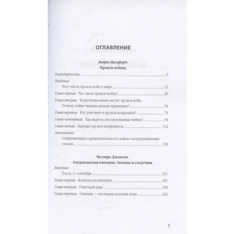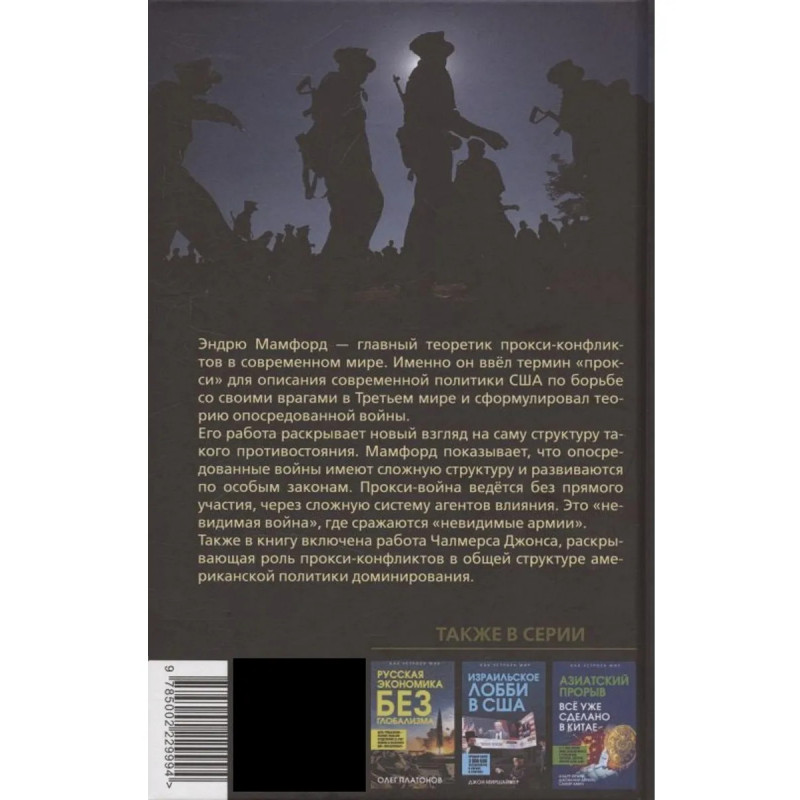 Эндрю Мамфорд — главный теоретик прокси-конфликтов в современном мире. Именно он ввёл термин «прокси» для описания современной политики США по борьбе со своими врагами в Третьем мире и сформулировал теорию опосредованной войны. Его работа раскрывает новый взгляд на саму структуру такого противостояния. Мамфорд показывает, что опосредованные войны имеют сложную структуру и развиваются по особым законам. Прокси-война ведётся без прямого участия, через сложную систему агентов влияния. Это «невидимая война», где сражаются «невидимые армии». Также в книгу включена работа Чалмерса Джонса, раскрывающая роль прокси-конфликтов в общей структуре американской политики доминирования.