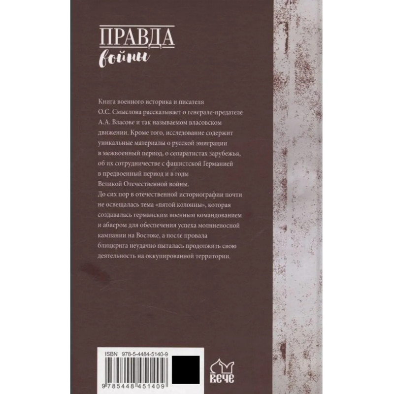 Новая книга военного историка и писателя О. С. Смыслова рассказывает о генерале-предателе А. А. Власове и так называемом власовском движении. Кроме того, исследование содержит уникальные материалы о русской эмиграции в межвоенный период, о сепаратистах зарубежья, об их сотрудничестве с фашистской Германией до начала Великой Отечественной войны и после. До сих пор в отечественной историографии почти не освещалась тема пятой колонны, которая создавалась германским военным командованием и абвером для обеспечения успеха молниеносной кампании на Востоке, а потом в результате провала блицкрига имела свое неудачное продолжение на оккупированной территории.