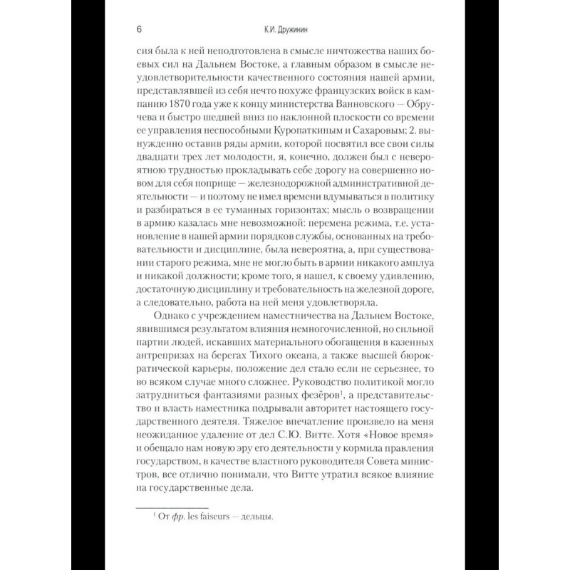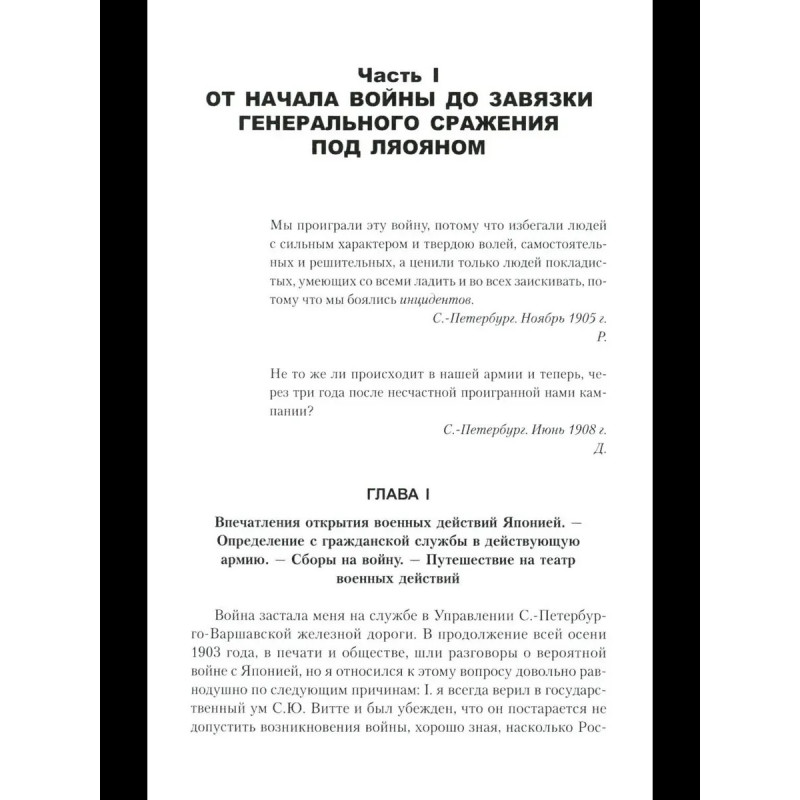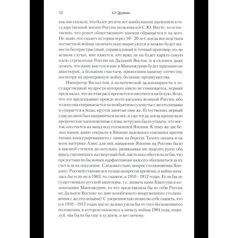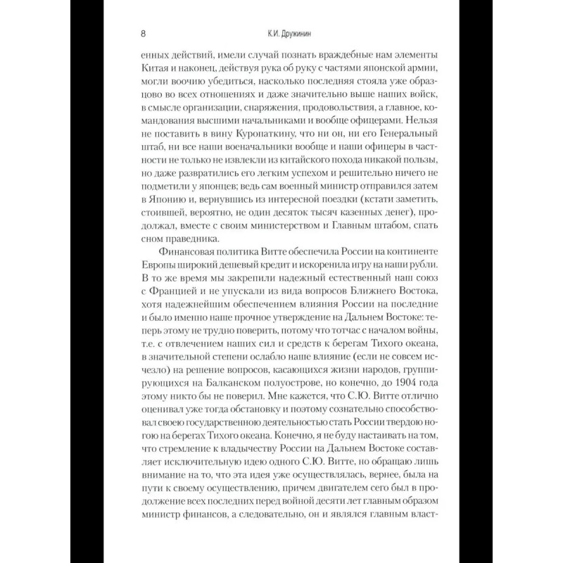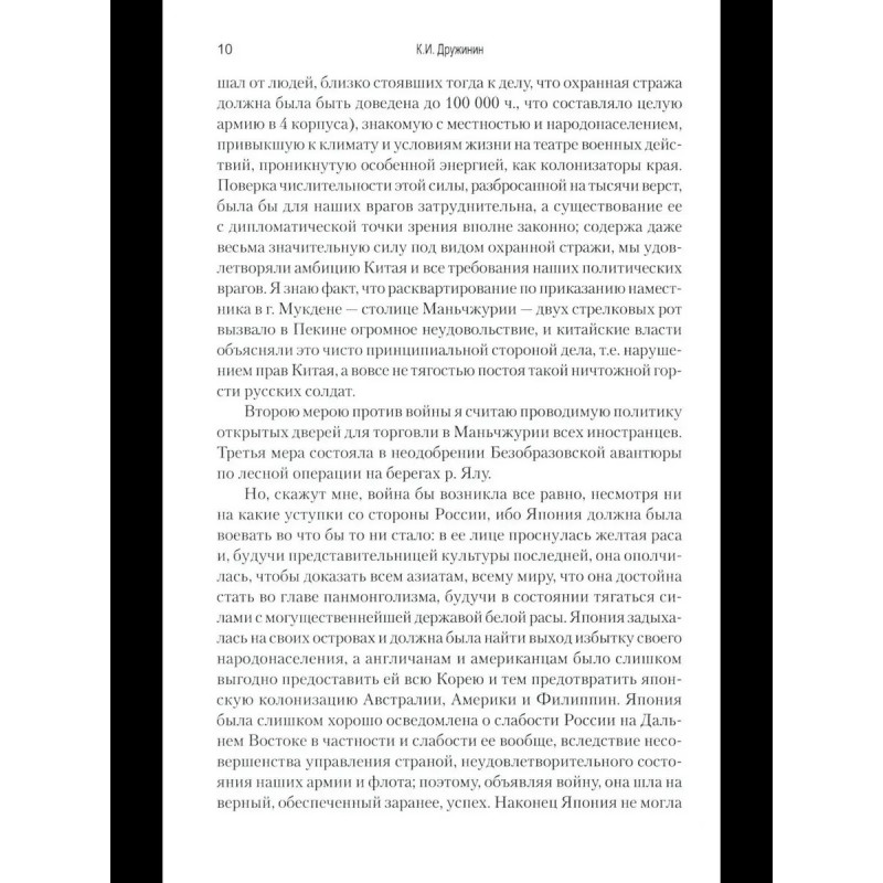 Дружинин К. И. Воспоминания о Русско-японской войне 1904-1905 годов участника-добровольца Автор книги известный военный писатель и публицист, генерал-майор Российской императорской армии Константин Иванович Дружинин. Выйдя в отставку по болезни в 1902 г., он с началом Русско-японской войны 19041905 гг. вернулся на службу и отправился добровольцем на театр военных действий в Маньчжурию. В своих воспоминаниях о войне Дружинин не только день за днем описывает события, участником которых ему довелось стать, но и подробно разбирает, подвергая заслуженной критике, действия командующего русской Маньчжурской армией генерала А. Н. Куропаткина.