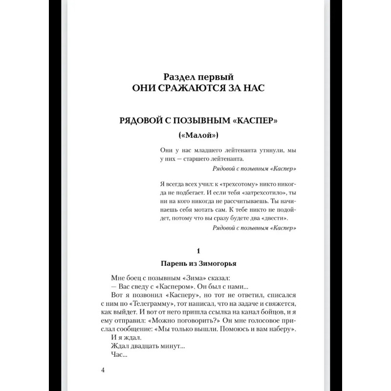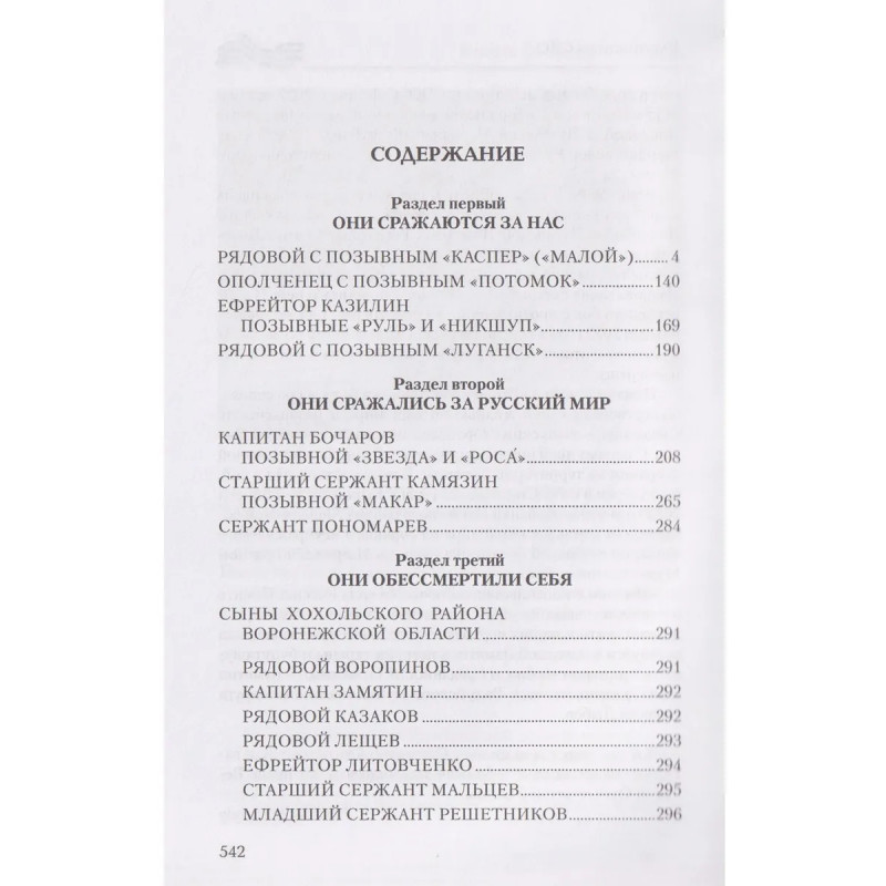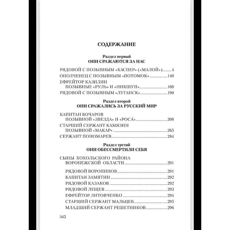 Эта книга насыщена судьбами неравнодушных к своей Родине парней и дочерей, перед которыми не стоял выбор — защищать Родину или нет. Не было выбора у рядового из Зимогорья с позывным «Каспер», который с восемнадцати лет совершал дерзкие рейды в тыл врага под Луганском, на СВО дошел до Николаева, охранял Каховскую ГЭС и сейчас бьется за Херсонские острова; о бывшем вагнеровце, ефрейторе Казилине, который прикрывал своих бойцов, пытался сбить «Бабу-ягу» и сбросами с двух «птичек» был ранен, и двадцать семь часов выползал к своим; о рядовом Василии с позывным «Луганск» родом из Красного Луча, который на себе испытал ужасы Майдана, в 4‑й казачьей бригаде брал в плен девяносто восемь украинских военных, раскручивал наведенные противником понтонные мосты, и те уплывали… Об отдавших свои жизни капитане Бочарове, сержанте Пономареве, старшем сержанте Камязине, о бойцах двух районов — Хохольского и Терновского — Воронежской области. Рассказано о жемчужине России — Железноводске, чьи сыны воевали и воюют, а режиссер и а