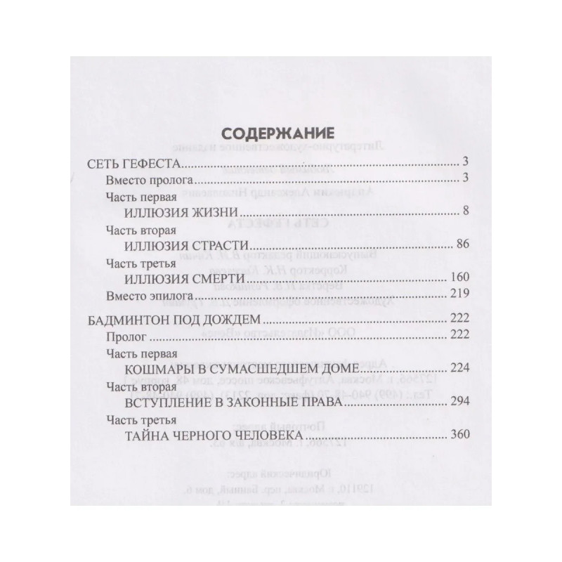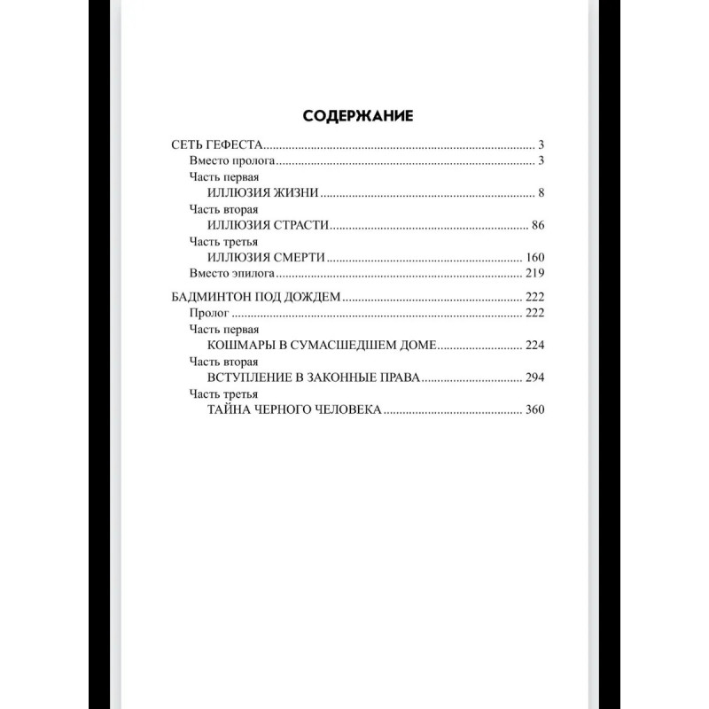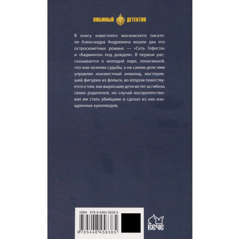 В книгу известного московского писателя Александра Андрюхина вошли два его остросюжетных романа: «Сеть Гефеста» и «Бадминтон под дождем». В первом рассказывается о молодой паре, полагавшей, что они хозяева судьбы, а на самом деле ими управлял неизвестный инвалид, мастеривший фигурки из фольги, во втором повествуется о том, как выросшие дети мстят за гибель своих родителей, но случай воспрепятствовал им стать убийцами и сделал из них изощренных кукловодов.