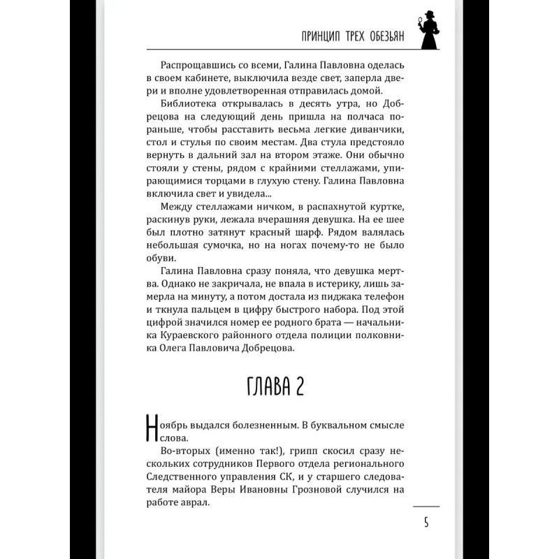Тайны могут быть завораживающими, могут быть и очень опасными — за них порой убивают. Вот и в романе Ирины Левит их достаточно. Тайна — зачем Агата Чернецкая, предпочитающая активный отдых, вдруг поехала среди зимы в санаторий «Светлое озеро», расположенный в небольшом райцентре Кураевск. Тайна — с какой целью девушка, равнодушная к стихам, отправилась на вечер поэзии, организованный в районной библиотеке. Тайна — почему Агату убили именно в библиотеке, причем забрав ее обувь. Тайна — что происходит в спокойном и респектабельном санатории. Тайна — появление там нового замруководителя межрайонного следственного отдела Вадима Павлинова, которого вместо Москвы отправили на периферию. Тайна — участие в расследовании старшего следователя регионального управления СК Веры Грозновой, приехавшей туда подлечить сына... В кабинете директора санатория Ирины Голубович висит панно с обезьянами: одна закрывает глаза, другая — уши, третья — рот. Ничего не вижу, ничего не слышу, ничего никому не скажу. Но когда все тайны удас