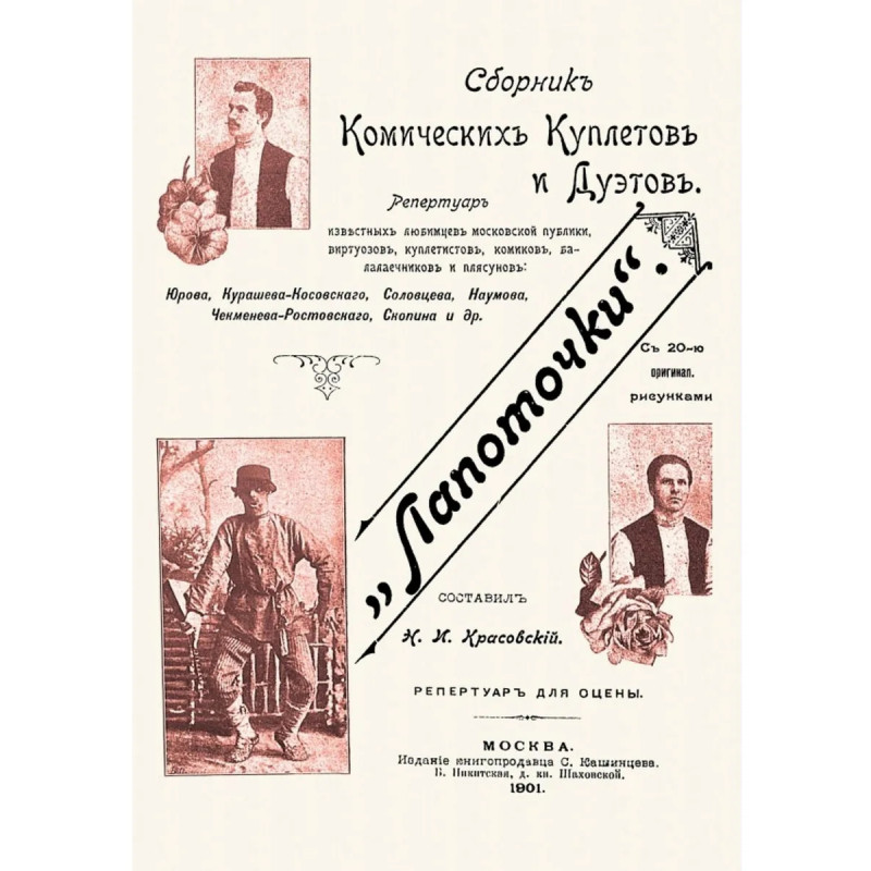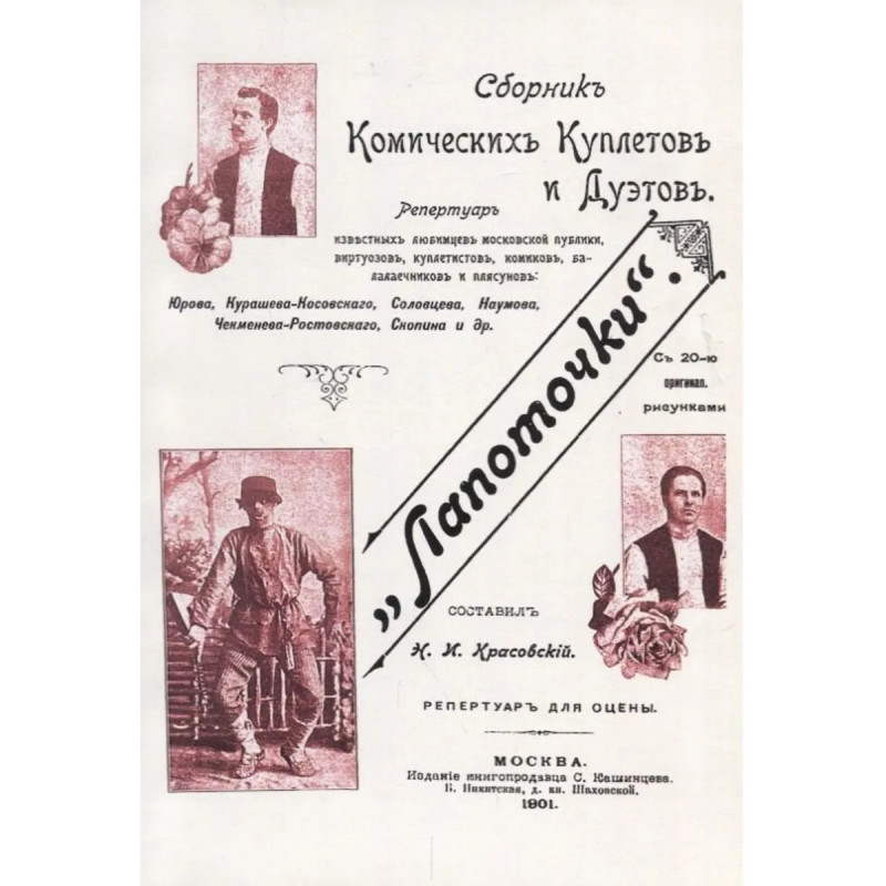 Репринт с издания. Репертуар (тексты) известных любимцев московской публики, виртуозов, куплетистов, комиков, балалаечников и плясунов 19-го - начала 20 века. Сост. Н. И. Красовский. Москва. С. Кашинцев, 1901. Книга изготовлена по технологии "печать по требованию". Тираж 30 экз.