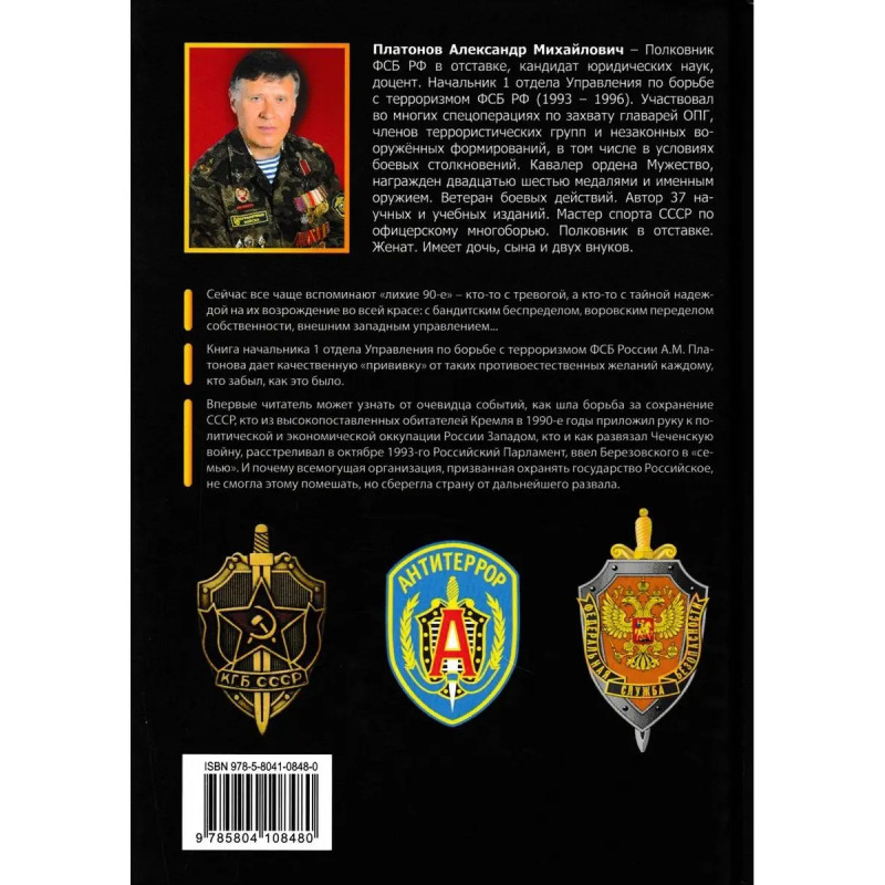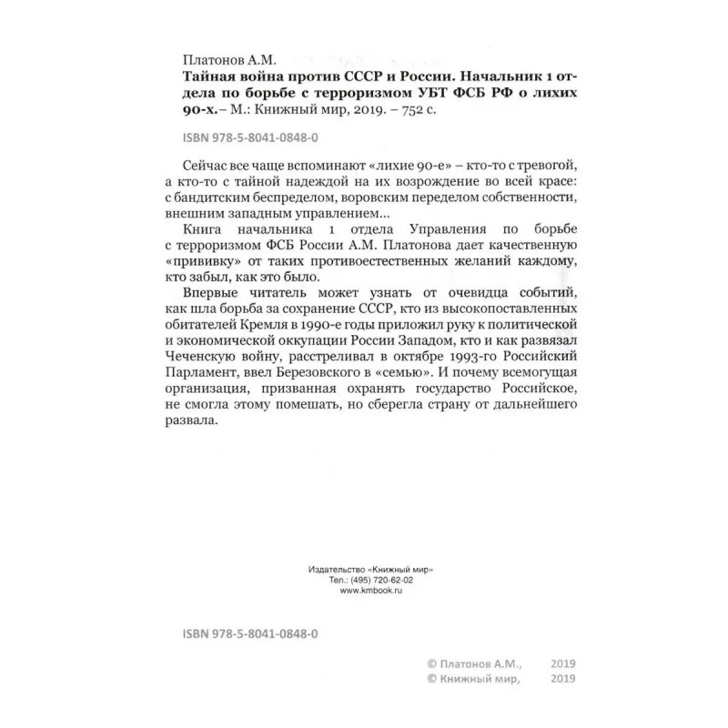 Тайная война против СССР и России. Начальник 1 отдела по борьбе с терроризмом УБТ ФСБ РФ о лихих 90-х. Платонов А. М. Сейчас все чаще вспоминают "лихие 90-е" кто-то с тревогой, а кто-то с тайной надеждой на их возрождение во всей красе: с бандитским беспределом, воровским переделом собственности, внешним западным управлениемКнига начальника 1 отдела Управления по борьбе с терроризмом ФСБ России А. М. Платонова дает качественную "прививку" от таких противоестественных желаний каждому, кто забыл, как это было. Впервые читатель может узнать от очевидца событий, как шла борьба за сохранение СССР, кто из высокопоставленных обитателей Кремля в 1990-е годы приложил руку к политической и экономической оккупации России Западом, кто и как развязал Чеченскую войну, расстреливал в октябре 1993-го Российский Парламент, ввел Березовского в "семью". И почему всемогущая организация, призванная охранять государство Российское, не смогла этому помешать, но сберегла страну от дальнейшего развала.
