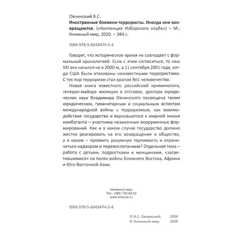 Иностранные боевики-террористы. Иногда они возвращаются. Говорят, что историческое время не совпадает с формальной хронологией. Если с этим согласиться, то наш XXI век начался не в 2000-м, а 11 сентября 2001 года, когда США были атакованы неизвестными террористами. С тех пор терроризм стал врагом №1 человечества. Новая книга известного российский криминолога, генерал-майора милиции в отставке, доктора юридических наук Владимира Овчинского посвящена таким юридическим, гуманитарным и социальным аспектам международной войны с терроризмом, как взаимодействие государства и вернувшегося к мирной жизни комбатанта участника незаконных вооруженных формирований. Как и в каком случае государство должно жестко реагировать на его возвращение в общество, а в каком проявить разумную терпимость и ограничиться надзором и перевоспитанием? Отдельная тема работа с детьми, подростками и женщинами, "засветившимися" на полях войны Ближнего Востока, Африки и Юго-Восточной Азии.