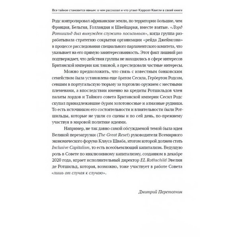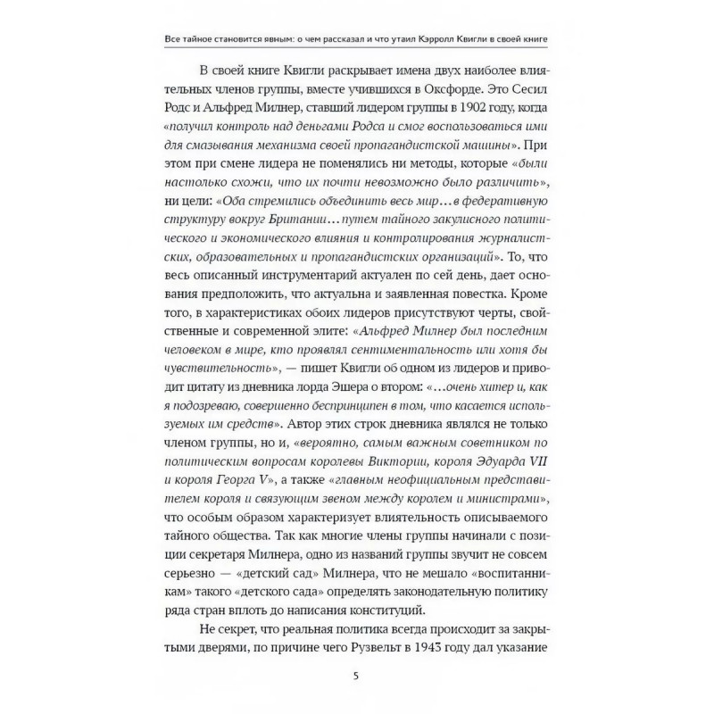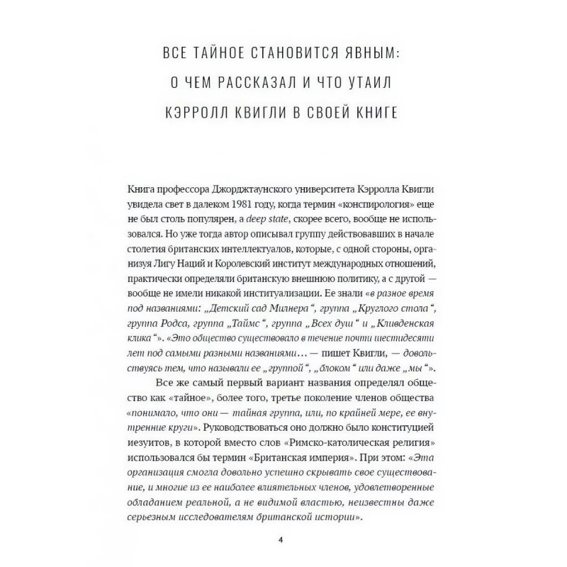 Англо-американский инстеблишмент. В истории мировой политики есть множество загадочных тайн, интересных моментов, головокружительных сюжетов. Большинство из них недоступно обычным людям, далёким от политических баталий. В настоящем издании приоткрывается завеса секретности, связанная с тайным обществом Великобритании, которое представляло собой одно из самых серьёзных исторических явлений двадцатого века и сыграло важнейшую роль в новейшей мировой истории. Общество "Круглый стол" было основано в 1891 году влиятельным политиком и предпринимателем Сесилом Родсом для управления колониями Великобритании. Обществу было суждено стать одной из главнейших сил воздействия на внешнюю политику Британской империи более чем на пятьдесят лет. Автор изучал историю "Круглого стола" на протяжении двадцати лет, у него был доступ ко множеству секретных источников. Книга снабжена любопытными фактами и читается как увлекательный исторический детектив.