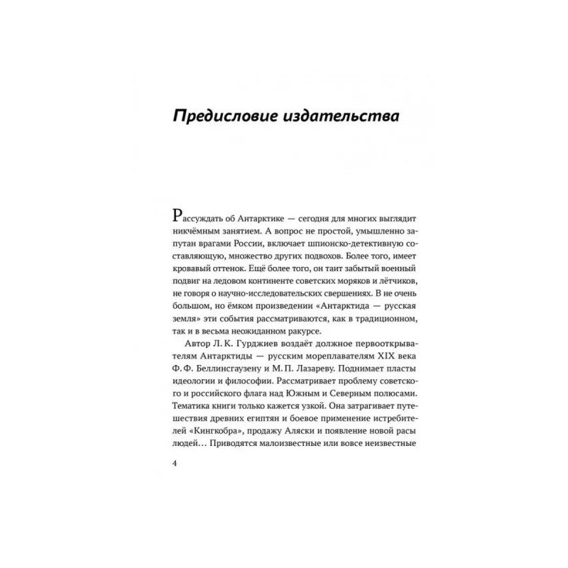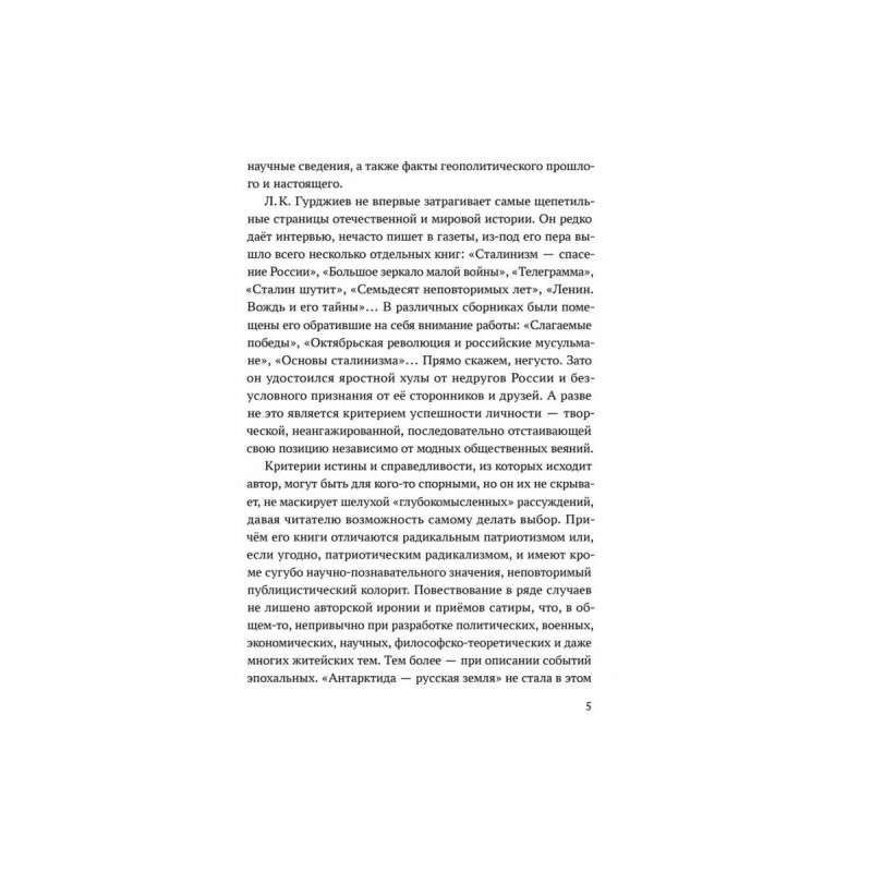Антарктида - Русская земля. Сталинский план преобразования мира. 2-е изд. , дополненное. Антарктида русская земля рассказывает о предыстории и истории открытия шестого континента планеты. Но ещё больше о том, что последовало после. А было всякое: и научные подвиги, и политическое вероломство, и боевые столкновения... Содержание книги богато фактологией, не лишённой сенсационности. Оно включает в себя не только географическую, но и технико-экономическую, антропологическую, шпионско-детективную, философско-идеологическую и другие составляющие. Автор Л. К. Гурджиев моряк, переводчик, педагог, журналист, востоковед давно разрабатывает темы, связанные со знаменательными вехами в летописи нашего отечества. Его новое произведение является достойным откликом на великие юбилеи ? 200-летие открытия Антарктиды и 140-летие со дня рождения И. В. Сталина. Но это также ответ на трагическую дату: 30-летие уничтожения СССР.