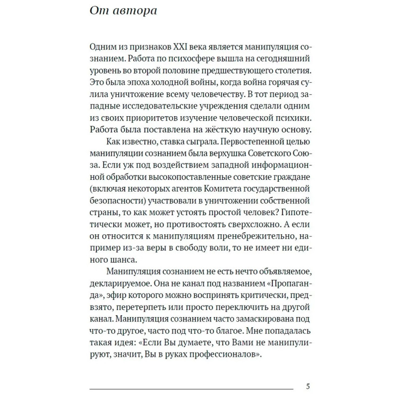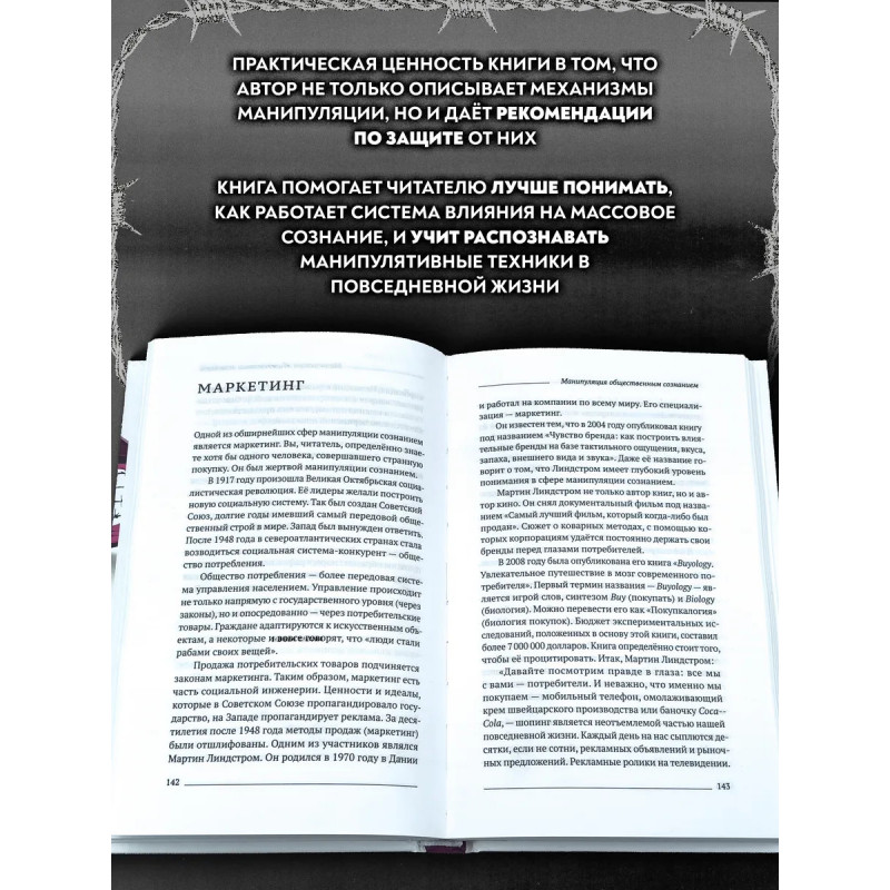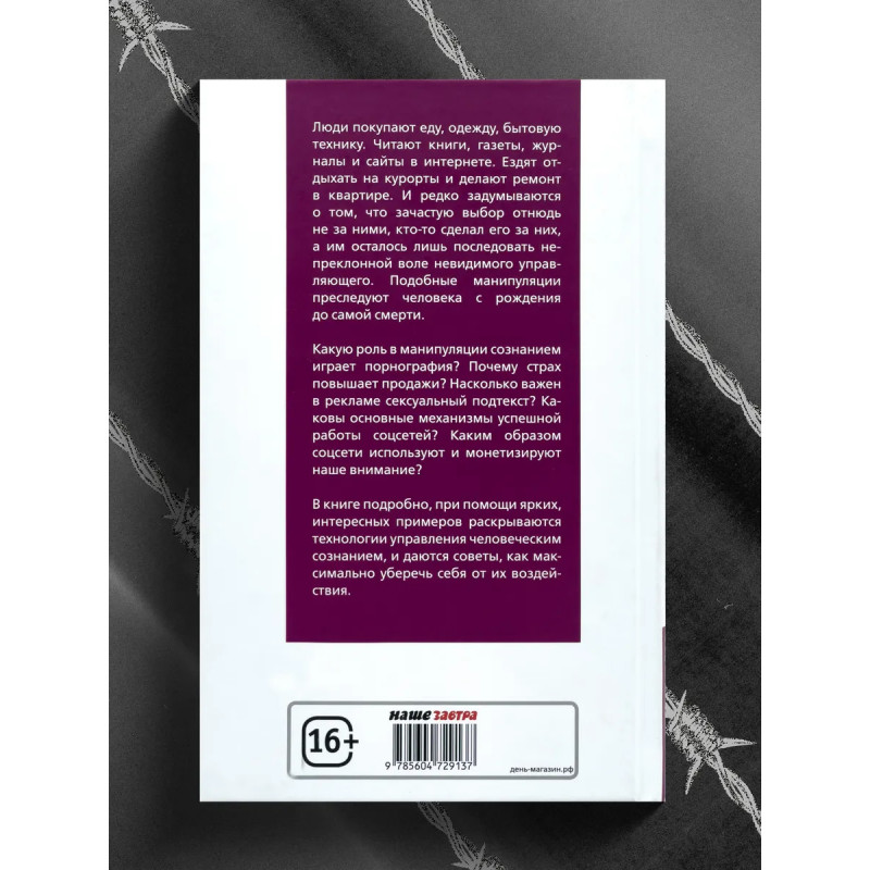 Манипуляция общественным сознанием. Люди покупают еду, одежду, бытовую технику. Читают книги, газеты, журналы и сайты в интернете. Ездят отдыхать на курорты и делают ремонт в квартире. И редко задумываются о том, что зачастую выбор отнюдь не за ними, кто-то сделал его за них, а им осталось лишь последовать непреклонной воле невидимого управляющего. Подобные манипуляции преследуют человека с рождения до самой смерти. Какую роль в манипуляции сознанием играет порнография? Почему страх повышает продажи? Насколько важен в рекламе сексуальный подтекст? Каковы основные механизмы успешной работы соцсетей? Каким образом соцсети используют и монетизируют наше внимание? В книге подробно, при помощи ярких, интересных примеров раскрываются технологии управления человеческим сознанием, и даются советы, как максимально уберечь себя от их воздействия.