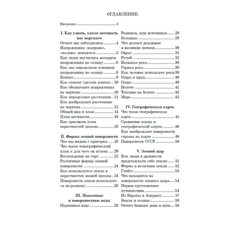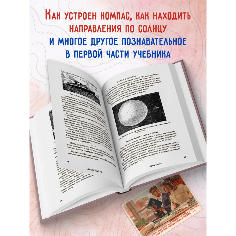 География. Учебник для третьего класса начальной школы. 1938 год. География изучает устройство окружающего мира и даёт основные знания о нашей планете. Настоящее издание представляет собой оригинальный текст, утверждённый Наркомпросом РСФСР в 1938 году. Как люди научились находить направления по солнцу? Как устроен компас? Как обозначают направления на чертеже? Как срисовать план окрестностей школы? Что такое топографический план и для чего он нужен? Как человек использует реки? Чем план отличается от географической карты? Как изображают поверхность страны на карте? Как люди в древности представляли себе землю? Что находится на поверхности земного шара? Отчего бывают день и ночь? Как определять направления на глобусе? Что такое климат? Как живут люди в полярных странах? Как охотятся эскимосы? Учебник написан доступным, внятным языком, снабжён интересными примерами, заданиями и тематическими иллюстрациями.