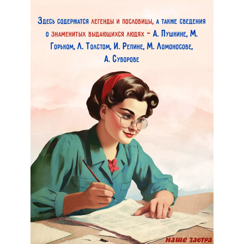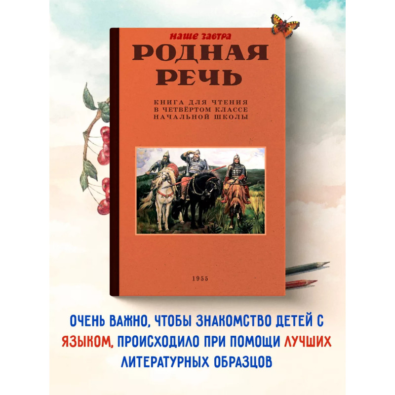 Родная речь. Книга для чтения в 4 классе. 1955 год. Соловьёва Е.Е., Щепетова Н.Н., Карпинская Л.А. Очень важно, чтобы знакомство детей с языком, со словом происходило при помощи лучших литературных образцов. Все поэтические и прозаические фрагменты, публикуемые в советских учебниках, проходили очень строгий и тщательный отбор. Настоящее издание представляет собой оригинальный текст пособия, утверждённого Министерством просвещения РСФСР в 1955 году. В пособии приведены произведения А, Пушкина, М. Лермонтова, Н. Некрасова, К. Чуковского, В. Бианки, А. Твардовского, В. Гаршина, И. Крылова, А. Чехова, И. Тургенева, В. Маяковского, В. Короленко, В. Катаева, В. Гюго, П. Вяземского, Д. Мамина-Сибиряка, Е. Баратынского. Кроме того, здесь содержатся легенды и пословицы, а также сведения о знаменитых выдающихся людях А. Пушкине, М. Горьком, Л. Толстом, И. Репине, М. Ломоносове, А. Суворове.