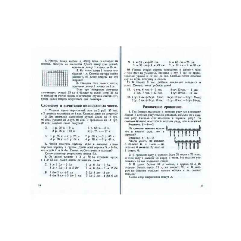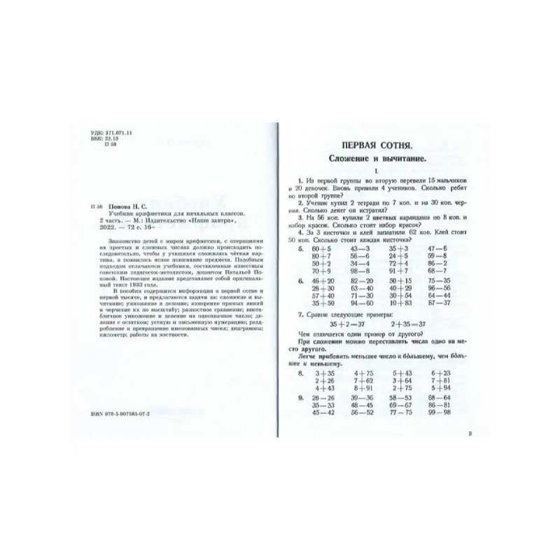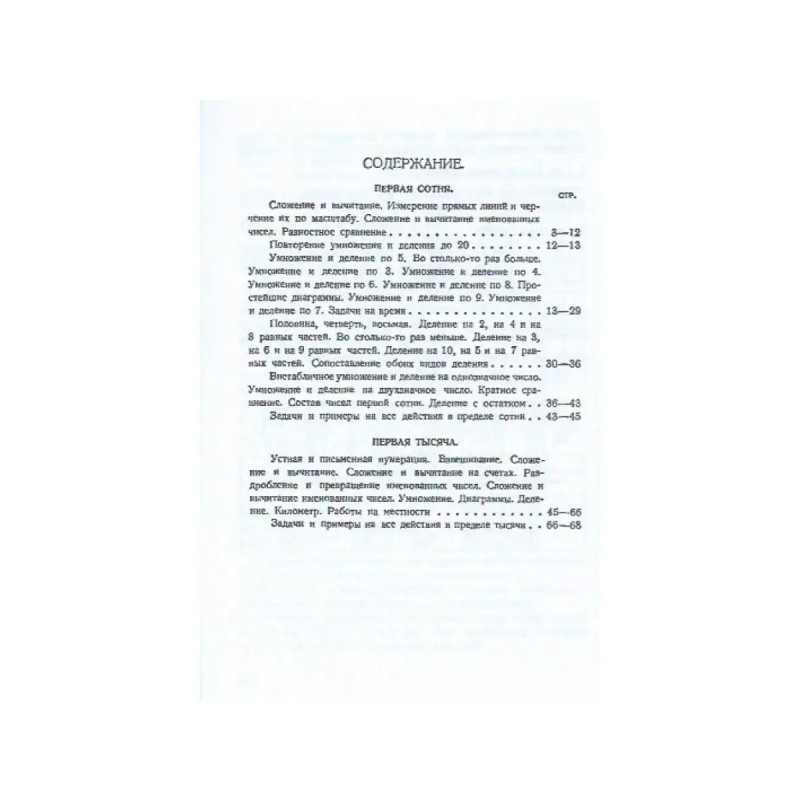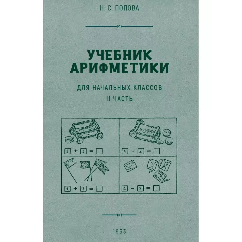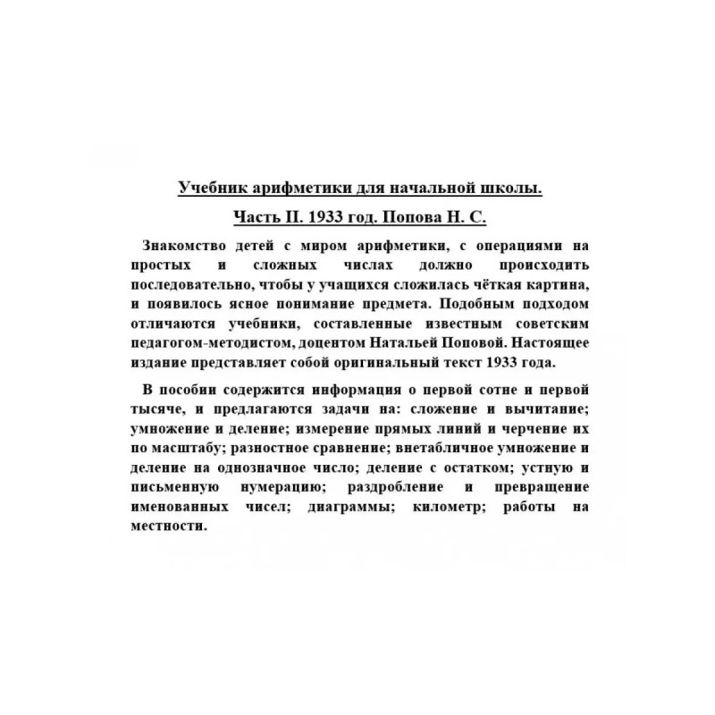 Учебник арифметики для начальной школы. Часть II. 1933 год. Попова Н. С. Знакомство детей с миром арифметики, с операциями на простых и сложных числах должно происходить последовательно, чтобы у учащихся сложилась чёткая картина, и появилось ясное понимание предмета. Подобным подходом отличаются учебники, составленные известным советским педагогом-методистом, доцентом Натальей Поповой. Настоящее издание представляет собой оригинальный текст 1933 года. В пособии содержится информация о первой сотне и первой тысяче, и предлагаются задачи на: сложение и вычитание; умножение и деление; измерение прямых линий и черчение их по масштабу; разностное сравнение; внетабличное умножение и деление на однозначное число; деление с остатком; устную и письменную нумерацию; раздробление и превращение именованных чисел; диаграммы; километр; работы на местности.