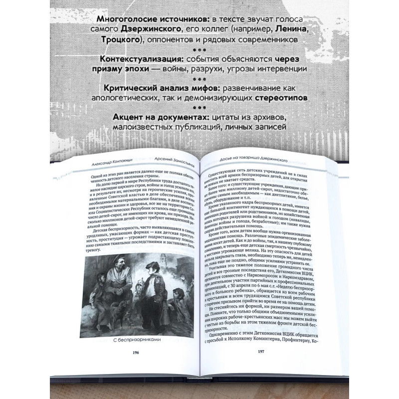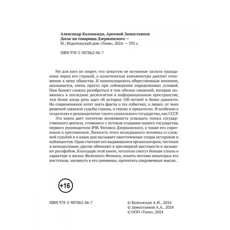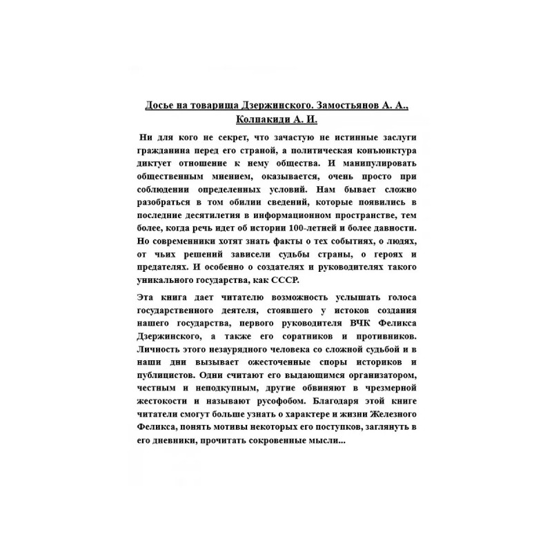 Досье на товарища Дзержинского. Замостьянов А. А., Колпакиди А. И.Ни для кого не секрет, что зачастую не истинные заслуги гражданина перед его страной, а политическая конъюнктура диктует отношение к нему общества. И манипулировать общественным мнением, оказывается, очень просто при соблюдении определенных условий. Нам бывает сложно разобраться в том обилии сведений, которые появились в последние десятилетия в информационном пространстве, тем более, когда речь идет об истории 100-летней и более давности. Но современники хотят знать факты о тех событиях, о людях, от чьих решений зависели судьбы страны, о героях и предателях. И особенно о создателях и руководителях такого уникального государства, как СССР.Эта книга дает читателю возможность услышать голоса государственного деятеля, стоявшего у истоков создания нашего государства, первого руководителя ВЧК Феликса Дзержинского, а также его соратников и противников. Личность этого незаурядного человека со сложной судьбой и в наши дни вызывает ожесточенные споры историков и публицистов. Одни считают его выдающимся организатором, честным и неподкупным, другие обвиняют в чрезмерной жестокости и называют русофобом. Благодаря этой книге читатели смогут больше узнать о характере и жизни Железного Феликса, понять мотивы некоторых его поступков, заглянуть в его дневники, прочитать сокровенные мысли...