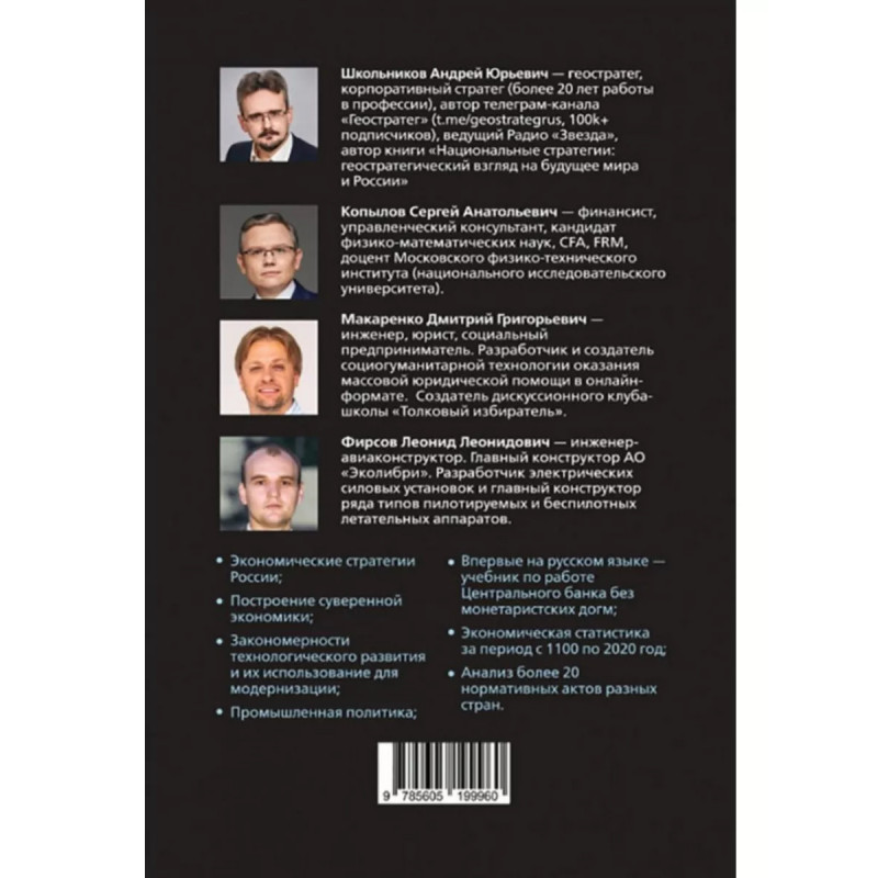 Экономика для тех, у кого есть будущее. Школьников А. Ю., Копылов С. А. Победа России на поле боя должна быть подкреплена сильной суверенной экономикой. Смена технологического уклада требует нестандартных решений. При этом, острых социально-экономических противоречий, свойственных Западу, в России нет. Есть возможность развития без предшествующего ему тяжёлого созидательного разрушения привычных структур. Единственный настоящий вызов как сфокусировать творческую энергию людей нашей страны. Необходимо создать общественную моду на технологические инновации, подчинить систему государственного управления всенародной идее технологического совершенствования. Книга содержит в себе примеры построения промышленной политики в увязке с закономерностями технологического развития в разных технологических укладах, рекомендации по формированию этой политики сейчас. Особое внимание уделяется формированию суверенной финансовой системы и собственной валютной зоны. Впервые на русском языке представлена современная теория организации работы Центрального банка, свободная от монетаристских догм. Материал подкрепляется многочисленными реальными данными, представленными в лучших традициях стратегического консалтинга.