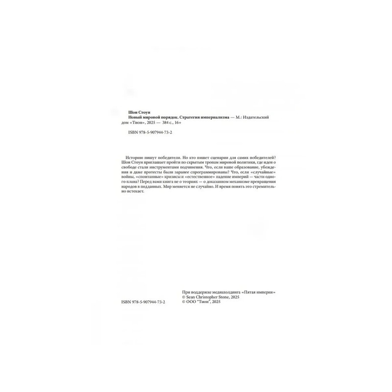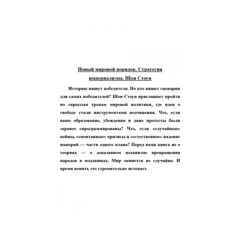 Новый мировой порядок. Стратегия империализма. Шон Стоун. Историю пишут победители. Но кто пишет сценарии для самих победителей? Шон Стоун приглашает пройти по скрытым тропам мировой политики, где идеи о свободе стали инструментами подчинения. Что, если ваше образование, убеждения и даже протесты были заранее спрограммированы? Что, если "случайные" войны, "спонтанные" кризисы и "естественное" падение империй части одного плана? Перед вами книга не о теориях о доказанном механизме превращения народов в подданных. Мир меняется не случайно. И время понять это стремительно истекает.