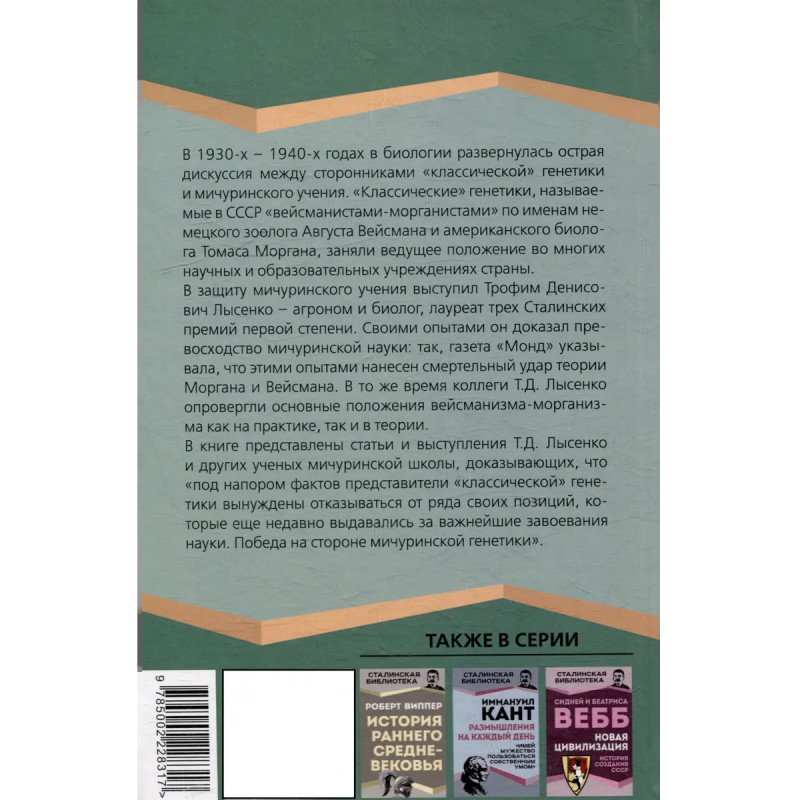 В 1930-х 1940-х годах в биологии развернулась острая дискуссия между сторонниками классической генетики и мичуринского учения. Классические генетики, называемые в СССР вейсманистами-морганистами по именам немецкого зоолога Августа Вейсмана и американского биолога Томаса Моргана, заняли ведущее положение во многих научных и образовательных учреждениях страны. В защиту мичуринского учения выступил Трофим Денисович Лысенко агроном и биолог, лауреат трех Сталинских премий первой степени. Своими опытами он доказал превосходство мичуринской науки: так, газета Монд указывала, что этими опытами нанесен смертельный удар теории Моргана и Вейсмана. В то же время коллеги Т. Д. Лысенко опровергли основные положения вейсманизма-морганизма как на практике,так и в теории. В книге представлены статьи и выступления Т. Д. Лысенко и других ученых мичуринской школы.