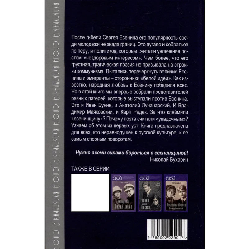 После гибели Сергея Есенина его популярность среди молодежи не знала границ. Это пугало и собратьев по перу, и политиков, которые считали увлечение поэтом нездоровым интересом. Чем более, что его грустная, трагическая поэзия не призывала на стройки коммунизма. Пытались перечеркнуть величие Есенина и эмигранты - сторонники белой идеи. Как известно, народная любовь к Есенину победила всех. Но в этой книге мы впервые собрали представителей разных лагерей, которые выступали против Есенина. Это и Иван Бунин, и Анатолий Луначарский. И Владимир Маяковский, и Карл Радек. За что клеймили есенинщину? Почему поэта считали упадочным? Узнаем об этом из первых уст. Книга предназначена для всех, кто неравнодушен к русской культуре, к ее самым спорным поворотам. ("Нужно всеми силами бороться с есенинщиной!" Николай Бухарин.)