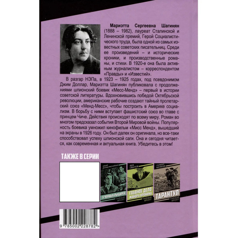 Мариэтта Сергеевна Шагинян (1888 - 1982), лауреат Сталинской и Ленинской премий, Герой Социалистического труда, была одной из самых известных советских писательниц. Среди ее произведений - и исторические хроники, и производственные романы, и стихи. В 1920-е она была активным журналистом - корреспондентом Правды и Известий. В разгар НЭПа, в 1923 - 1925 годах, под псевдонимом Джим Доллар, Мариэтта Шагинян публиковала с продолжениями шпионский боевик Месс-Менд - первый в истории советской литературы. Вдохновившись победой Октябрьской революции, американские рабочие создают тайный пролетарский союз Менд-Месс, чтобы построить в Америке социализм. В борьбу с ними вступает фашистский союз во главе с принцем Чиче. Действия происходят по всему миру. Роман во многом предсказал события Второй Мировой войны.