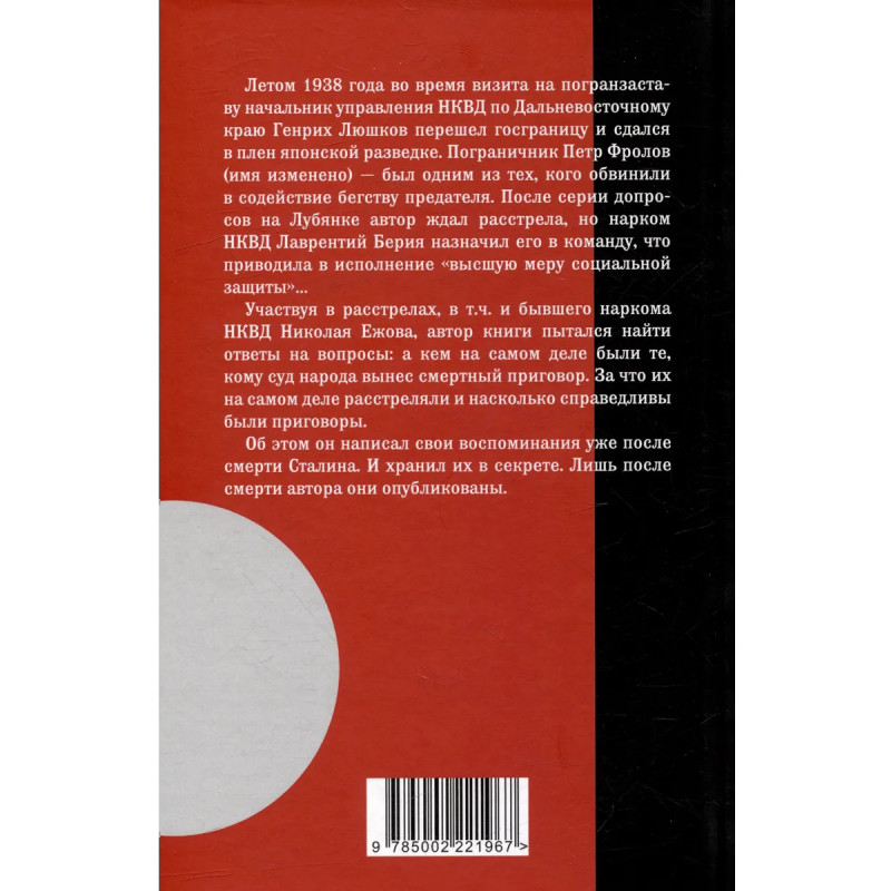 Летом 1938 года во время визита на погранзаставу начальник управления НКВД по Дальневосточному краю Генрих Люшков перешел госграницу и сдался в плен японской разведке. Пограничник Петр Фролов (имя изменено) - был одним из тех, кого обвинили в содействие бегству предателя. После серии допросов на Лубянке автор ждал расстрела, но нарком НКВД Лаврентий Берия назначил его в команду, что приводила в исполнение «высшую меру социальной защиты»… Участвуя в расстрелах, в т.ч. и бывшего наркома НКВД Николая Ежова, автор книги пытался найти ответы на вопросы: а кем на самом деле были те, кому суд народа вынес смертный приговор. За что их на самом деле расстреляли и насколько справедливы были приговоры. Об этом он написал свои воспоминания уже после смерти Сталина. И хранил их в секрете. Лишь после смерти автора они опубликованы.