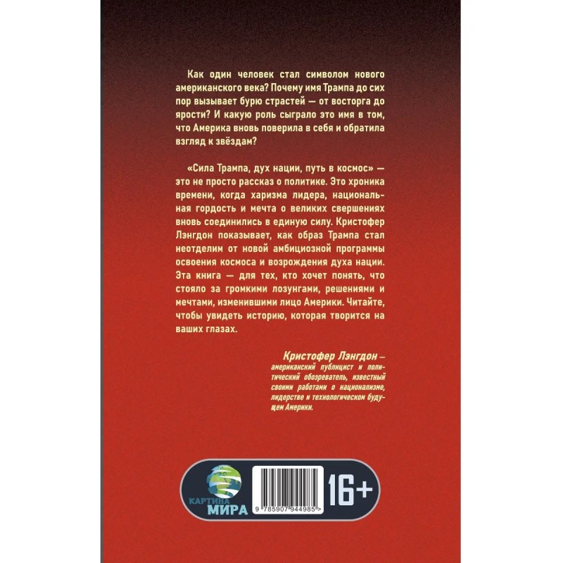 «Сила Трампа, дух нации, путь в космос» — это не просто рассказ о политике. Это хроника времени, когда харизма лидера, национальная гордость и мечта о великих свершениях вновь соединились в единую силу. Кристофер Лэнгдон показывает, как образ Трампа стал неотделим от новой амбициозной программы освоения космоса и возрождения духа нации. Эта книга — для тех, кто хочет понять, что стояло за громкими лозунгами, решениями и мечтами, изменившими лицо Америки. Читайте, чтобы увидеть историю, которая творится на ваших глазах.