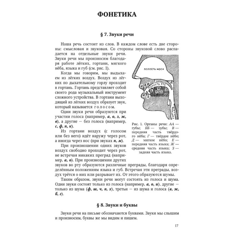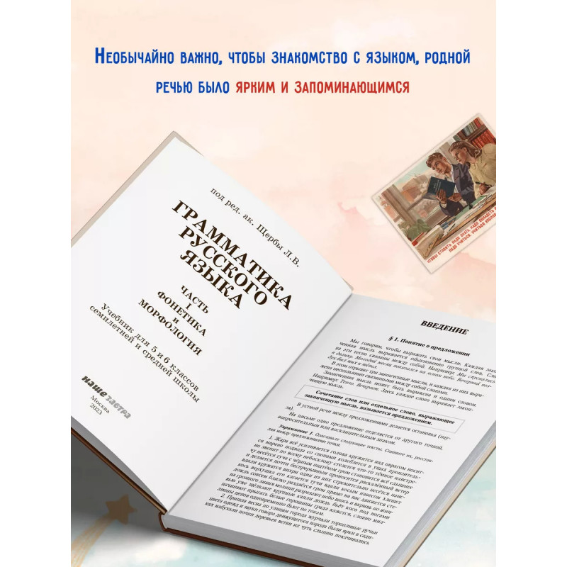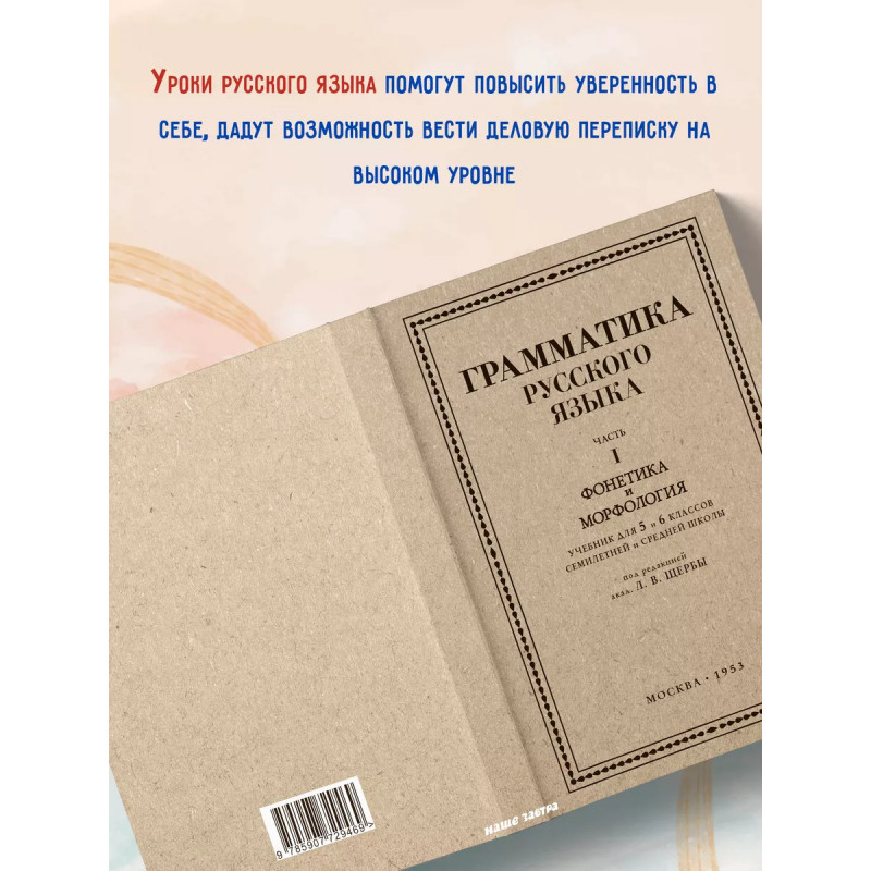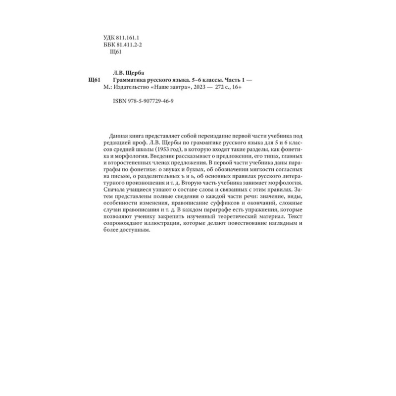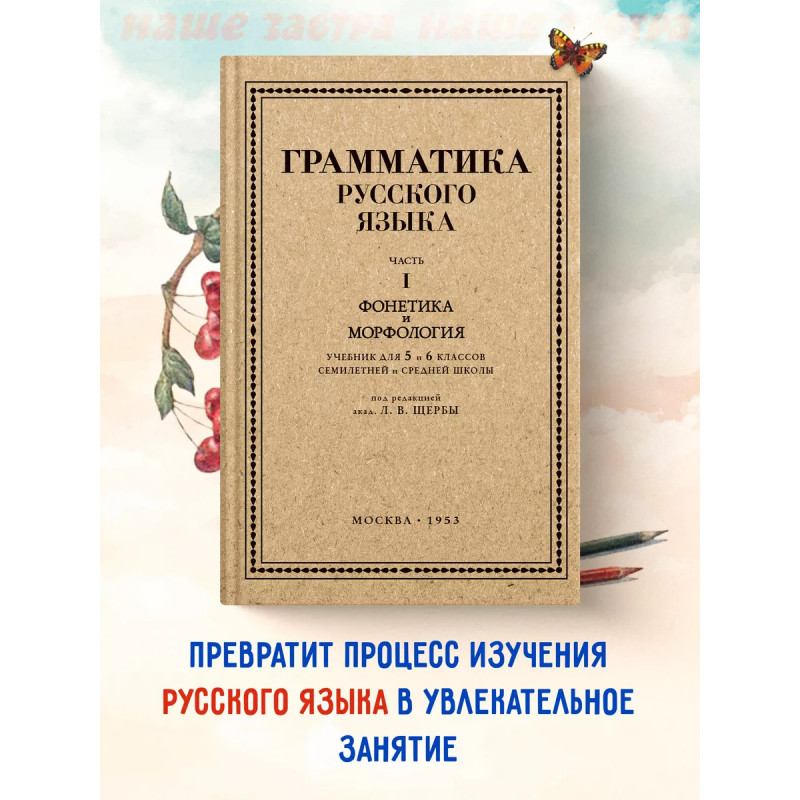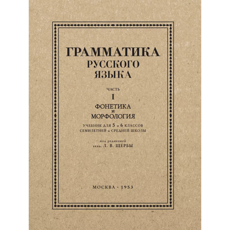 Грамматика русского языка. Часть I. Фонетика и морфология. Для 5 6 классов. 1953 год. Под ред. ак. Щербы Л. В. Данная книга представляет собой переиздание первой части учебника под редакцией проф. Л. В. Щербы по грамматике русского языка для 5 и 6 классов средней школы (1953 год), в которую входят такие разделы, как фонетика и морфология. Введение рассказывает о предложении, его типах, главных и второстепенных членах предложения. В первой части учебника даны параграфы по фонетике: о звуках и буквах, об обозначении мягкости согласных на письме, о разделительных ъ и ь, об основных правилах русского литературного произношения и т. д. Вторую часть учебника занимает морфология. Сначала учащиеся узнают о составе слова и связанных с этим правилах. Затем представлены полные сведения о каждой части речи: значение, виды особенности изменения, правописание суффиксов и окончаний, сложные случаи правописания и т. д. В каждом параграфе есть упражнения, которые позволяют ученику закрепить изученный теоретический материал. Текст сопровождают иллюстрации, которые делают повествование наглядным и более доступным.