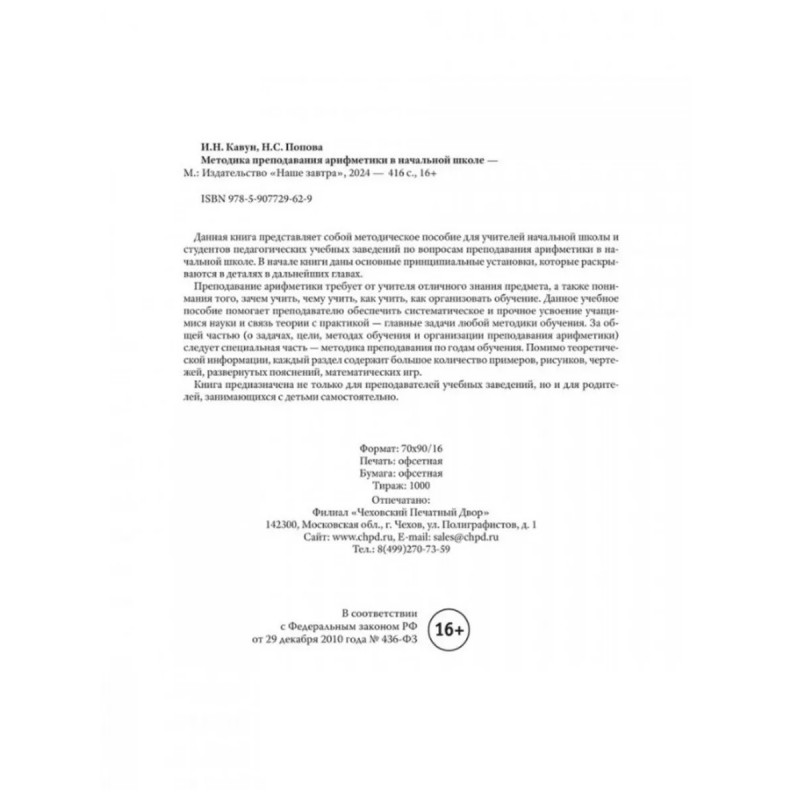 Методика преподавания арифметики в начальной школе. 1936 год. Кавун И.Н., Попова Н.С. Данная книга представляет собой методическое пособие для учителей начальной школы и студентов педагогических учебных заведений по вопросам преподавания арифметики в начальной школе. В начале книги даны основные принципиальные установки, которые раскрываются в деталях в дальнейших главах.Преподавание арифметики требует от учителя отличного знания предмета, а также понимания того, зачем учить, чему учить, как учить, как организовать обучение. Данное учебное пособие помогает преподавателю обеспечить систематическое и прочное усвоение учащимися науки и связь теории с практикой главные задачи любой методики обучения. За общей частью (о задачах, цели, методах обучения и организации преподавания арифметики) следует специальная часть методика преподавания по годам обучения. Помимо теоретической информации, каждый раздел содержит большое количество примеров, рисунков, чертежей, развернутых пояснений, математических игр.Книга предназначена не только для преподавателей учебных заведений, но и для родителей, занимающихся с детьми самостоятельно.
