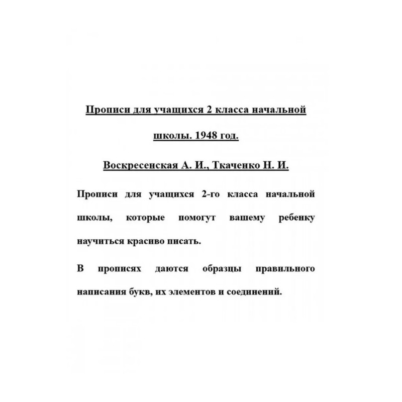 В ПРОПИСЯХ НЕ ПИШУТ, ЭТО ОБРАЗЕЦ ДЛЯ НАПИСАНИЯ! Прописи для учащихся 2 класса начальной школы. 1948 год. Воскресенская А.И., Ткаченко Н.И. Прописи для учащихся 2-го класса начальной школы, которые помогут вашему ребенку научиться красиво писать.В прописях даются образцы правильного написания букв, их элементов и соединений.