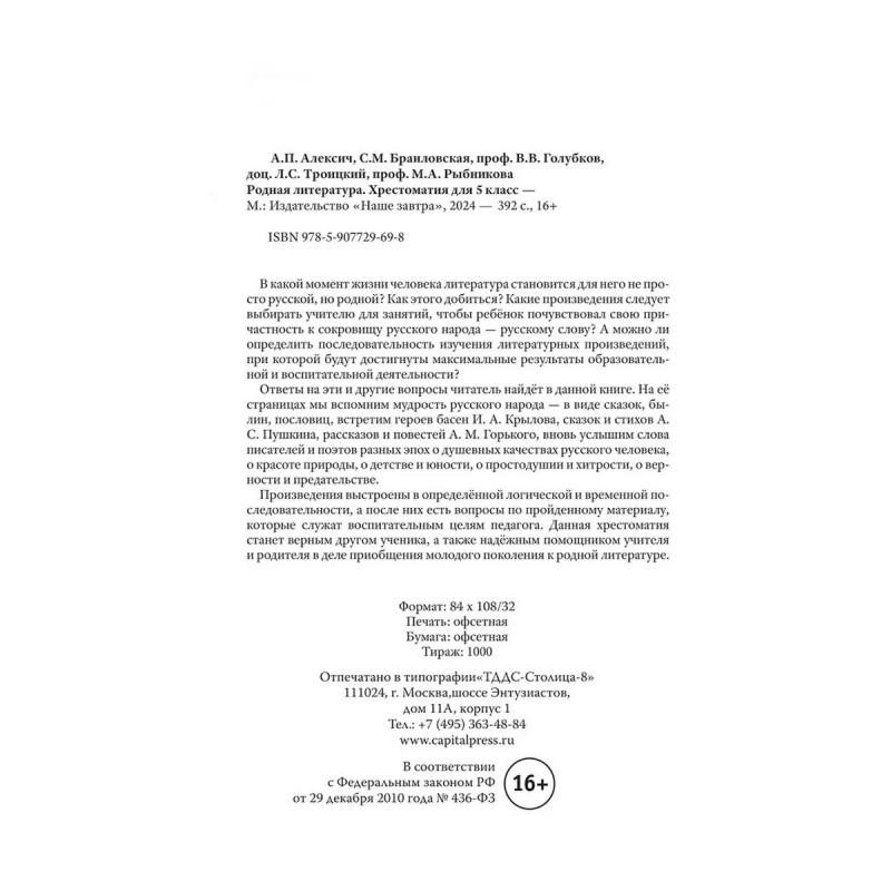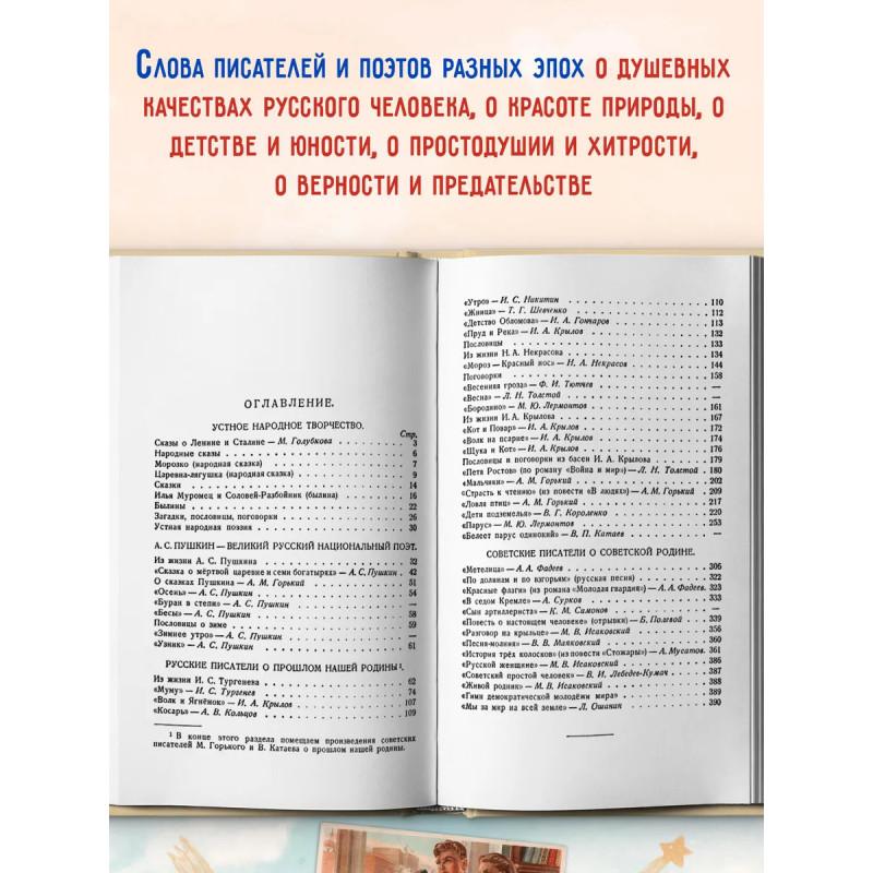 Родная литература. Хрестоматия для 5 кл. 1952 год. Проф. Голубков, проф. Рыбникова и др. В какой момент жизни человека литература становится для него не просто русской, но родной? Как этого добиться? Какие произведения следует выбирать учителю для занятий, чтобы ребёнок почувствовал свою причастность к сокровищу русского народа русскому слову? А можно ли определить последовательность изучения литературных произведений, при которой будут достигнуты максимальные результаты образовательной и воспитательной деятельности?Ответы на эти и другие вопросы читатель найдёт в данной книге. На её страницах мы вспомним мудрость русского народа в виде сказок, былин, пословиц, встретим героев басен И. А. Крылова, сказок и стихов А. С. Пушкина, рассказов и повестей А. М. Горького, вновь услышим слова писателей и поэтов разных эпох о душевных качествах русского человека, о красоте природы, о детстве и юности, о простодушии и хитрости, о верности и предательстве.Произведения выстроены в определённой логической и временной последовательности, а после них есть вопросы по пройденному материалу, которые служат воспитательным целям педагога. Данная хрестоматия станет верным другом ученика, а также надёжным помощником учителя и родителя в деле приобщения молодого поколения к родной литературе.