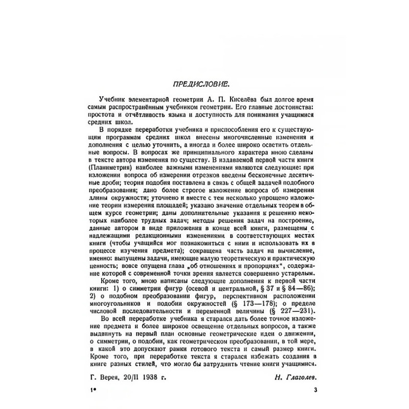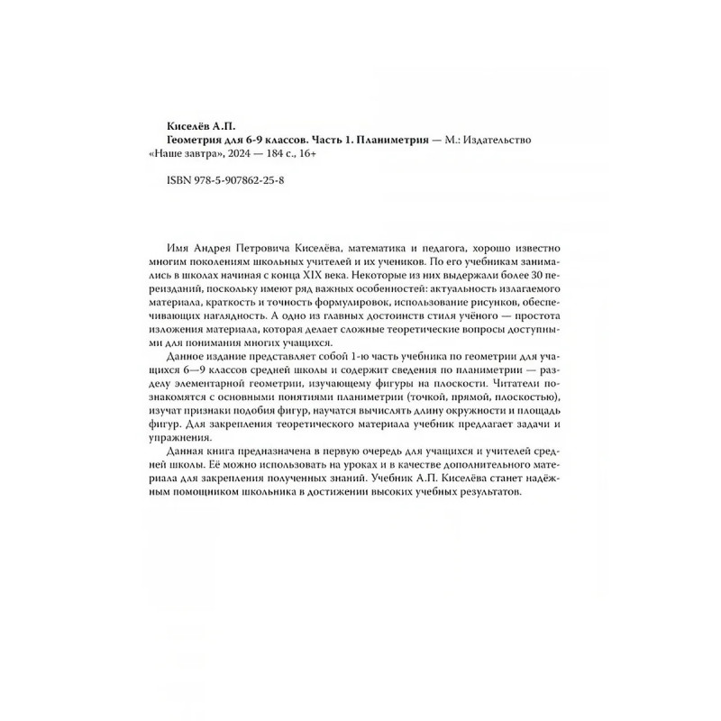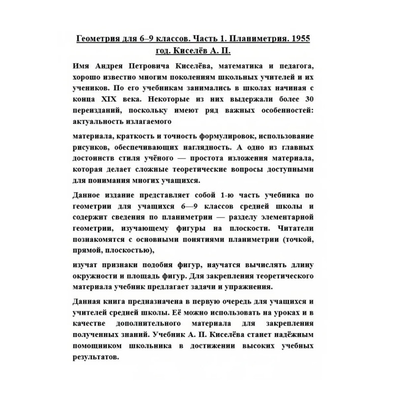 Геометрия. Советский учебник для 6-9 классов. Часть 1. Планиметрия. 1962 год. Киселёв А.П. Имя Андрея Петровича Киселёва, математика и педагога, хорошо известно многим поколениям школьных учителей и их учеников. По его учебникам занимались в школах начиная с конца XIX века. Некоторые из них выдержали более 30 переизданий, поскольку имеют ряд важных особенностей: актуальность излагаемогоматериала, краткость и точность формулировок, использование рисунков, обеспечивающих наглядность. А одно из главных достоинств стиля учёного простота изложения материала, которая делает сложные теоретические вопросы доступными для понимания многих учащихся.Данное издание представляет собой 1-ю часть учебника по геометрии для учащихся 69 классов средней школы и содержит сведения по планиметрии разделу элементарной геометрии, изучающему фигуры на плоскости. Читатели познакомятся с основными понятиями планиметрии (точкой, прямой, плоскостью),изучат признаки подобия фигур, научатся вычислять длину окружности и площадь фигур. Для закрепления теоретического материала учебник предлагает задачи и упражнения.Данная книга предназначена в первую очередь для учащихся и учителей средней школы. Её можно использовать на уроках и в качестве дополнительного материала для закрепления полученных знаний. Учебник А. П. Киселёва станет надёжным помощником школьника в достижении высоких учебных результатов.