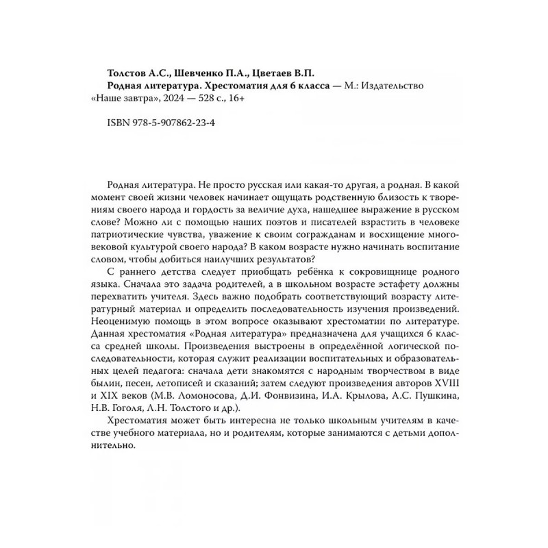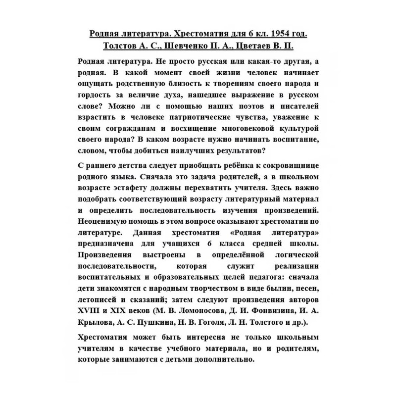 Родная литература. Хрестоматия для 6 кл. 1954 год. Толстов А.С., Шевченко П.А., Цветаев В.П. Родная литература. Не просто русская или какая-то другая, а родная. В какой момент своей жизни человек начинает ощущать родственную близость к творениям своего народа и гордость за величие духа, нашедшее выражение в русском слове? Можно ли с помощью наших поэтов и писателей взрастить в человеке патриотические чувства, уважение к своим согражданам и восхищение многовековой культурой своего народа? В каком возрасте нужно начинать воспитание, словом, чтобы добиться наилучших результатов?С раннего детства следует приобщать ребёнка к сокровищнице родного языка. Сначала это задача родителей, а в школьном возрасте эстафету должны перехватить учителя. Здесь важно подобрать соответствующий возрасту литературный материал и определить последовательность изучения произведений. Неоценимую помощь в этом вопросе оказывают хрестоматии по литературе. Данная хрестоматия "Родная литература" предназначена для учащихся 6 класса средней школы. Произведения выстроены в определённой логической последовательности, которая служит реализации воспитательных и образовательных целей педагога: сначала дети знакомятся с народным творчеством в виде былин, песен, летописей и сказаний; затем следуют произведения авторов XVIII и XIX веков (М. В. Ломоносова, Д. И. Фонвизина, И. А. Крылова, А. С. Пушкина, Н. В. Гоголя, Л. Н. Толстого и др.).Хрестоматия может быть интересна не только школьным учителям в качестве учебного материала, но и родителям, которые занимаются с детьми дополнительно.
