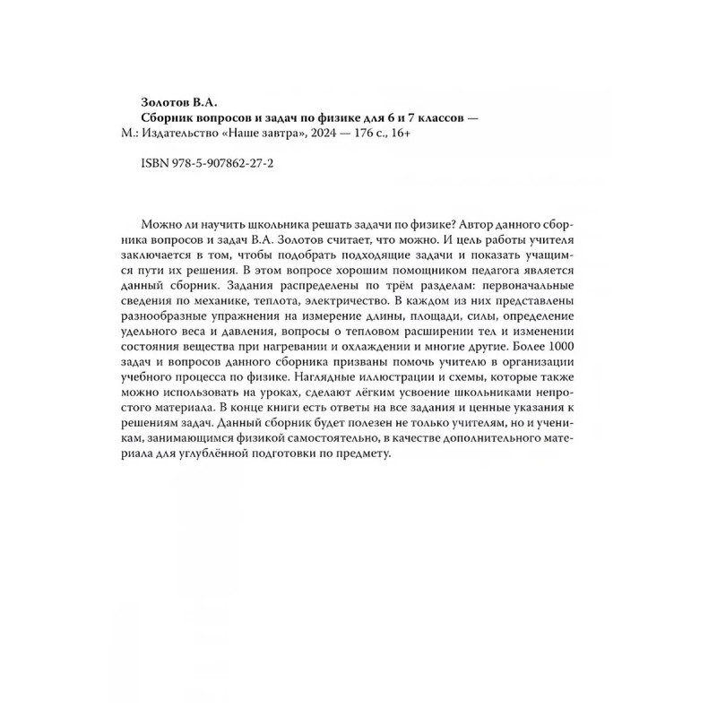 Сборник вопросов и задач по физике для 6 и 7 классов. Золотов В.А. Можно ли научить школьника решать задачи по физике? Автор данного сборника вопросов и задач В. А. Золотов считает, что можно. И цель работы учителя заключается в том, чтобы подобрать подходящие задачи и показать учащимся пути их решения. В этом вопросе хорошим помощником педагога является данный сборник. Задания распределены по трём разделам: первоначальные сведения по механике, теплота, электричество. В каждом из них представлены разнообразные упражнения на измерение длины, площади, силы, определение удельного веса и давления, вопросы о тепловом расширении тел и изменении состояния вещества при нагревании и охлаждении и многие другие. Более 1000 задач и вопросов данного сборника призваны помочь учителю в организации учебного процесса по физике. Наглядные иллюстрации и схемы, которые также можно использовать на уроках, сделают лёгким усвоение школьниками непростого материала. В конце книги есть ответы на все задания и ценные указания к решениям задач. Данный сборник будет полезен не только учителям, но и ученикам, занимающимся физикой самостоятельно, в качестве дополнительного материала для углублённой подготовки по предмету.