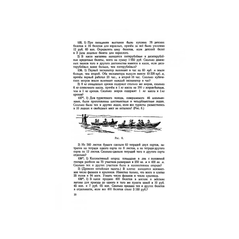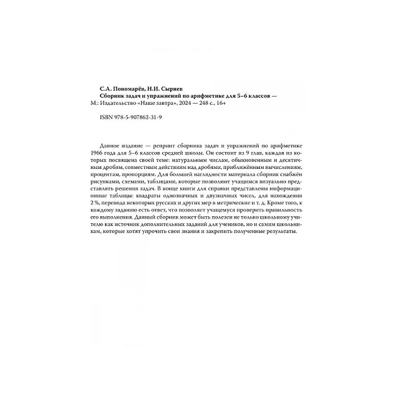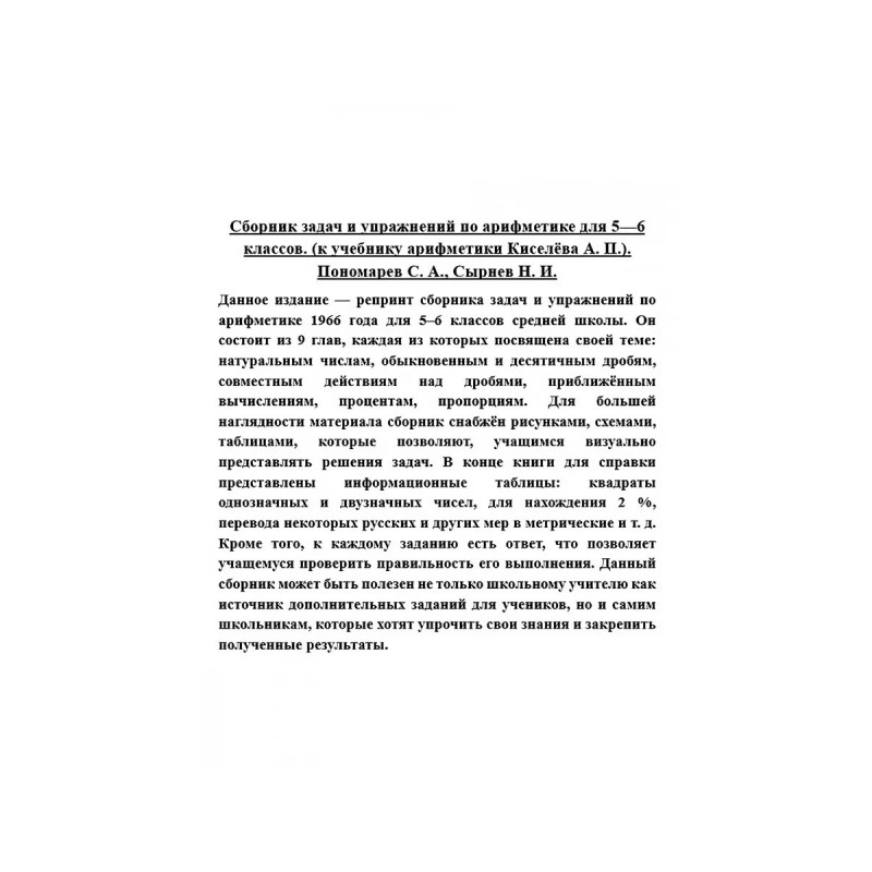 Сборник задач и упражнений по арифметике для 5-6 классов. (к учебнику арифметики Киселёва А.П.). Пономарев С.А., Сырнев Н.И. Данное издание репринт сборника задач и упражнений по арифметике 1966 года для 56 классов средней школы. Он состоит из 9 глав, каждая из которых посвящена своей теме: натуральным числам, обыкновенным и десятичным дробям, совместным действиям над дробями, приближённым вычислениям, процентам, пропорциям. Для большей наглядности материала сборник снабжён рисунками, схемами, таблицами, которые позволяют, учащимся визуально представлять решения задач. В конце книги для справки представлены информационные таблицы: квадраты однозначных и двузначных чисел, для нахождения 2 %, перевода некоторых русских и других мер в метрические и т. д. Кроме того, к каждому заданию есть ответ, что позволяет учащемуся проверить правильность его выполнения. Данный сборник может быть полезен не только школьному учителю как источник дополнительных заданий для учеников, но и самим школьникам, которые хотят упрочить свои знания и закрепить полученные результаты.