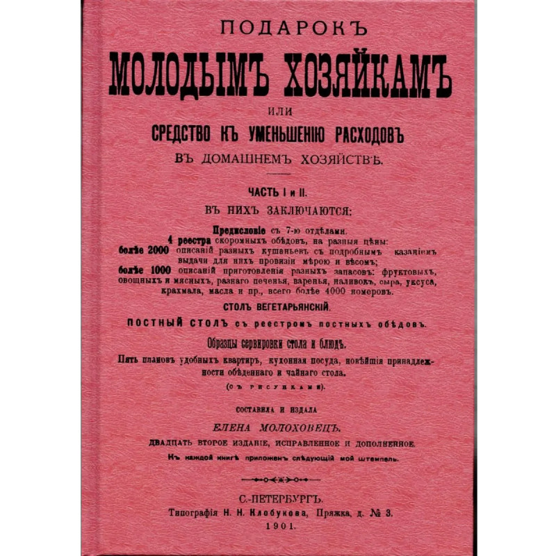 Репринт с самого полного 22-го издания. СПб., 1901. Доптираж. В двух частях. Содержит 7 отделов, 4 реестра скоромных обедов, более 2000 описаний разных блюд, более 1000 описаний приготовления разных запасов (фруктовых, овощных и мясных, разного печенья, варенья, наливок, сыра, уксуса, крахмала, масла и пр.), стол вегетарианский, постный стол с реестром постных обедов, образцы сервировки стола и блюд (с рисунками). В книге более 4000 рецептов для семей различного достатка, полезные советы по заготовке и хранению продуктов. Тираж 30 экз. выполнен по технологии print-on-demand.