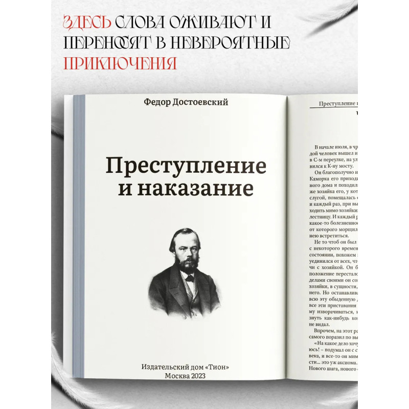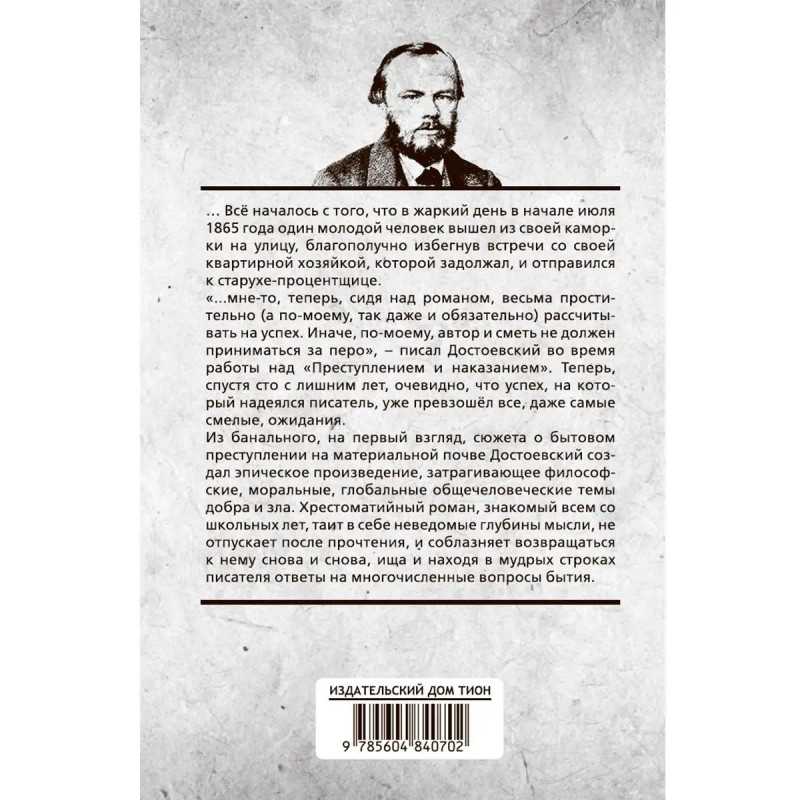 Преступление и наказание. Всё началось с того, что в жаркий день в начале июля 1865 года один молодой человек вышел из своей каморки на улицу, благополучно избегнув встречи со своей квартирной хозяйкой, которой задолжал, и отправился к старухе-процентщице. "... мне-то, теперь, сидя над романом, весьма простительно (а по-моему, так даже и обязательно) рассчитывать на успех. Иначе, по-моему, автор и сметь не должен приниматься за перо", писал Достоевский во время работы над "Преступлением и наказанием". Теперь, спустя сто с лишним лет, очевидно, что успех, на который надеялся писатель, уже превзошёл все, даже самые смелые, ожидания. Из банального, на первый взгляд, сюжета о бытовом преступлении на материальной почве Достоевский создал эпическое произведение, затрагивающее философские, моральные, глобальные общечеловеческие темы добра и зла. Хрестоматийный роман, знакомый всем со школьных лет, таит в себе неведомые глубины мысли, не отпускает после прочтения, и соблазняет возвращаться к нему снова и снова, ища и находя в мудрых строках писателя ответы на многочисленные вопросы бытия.