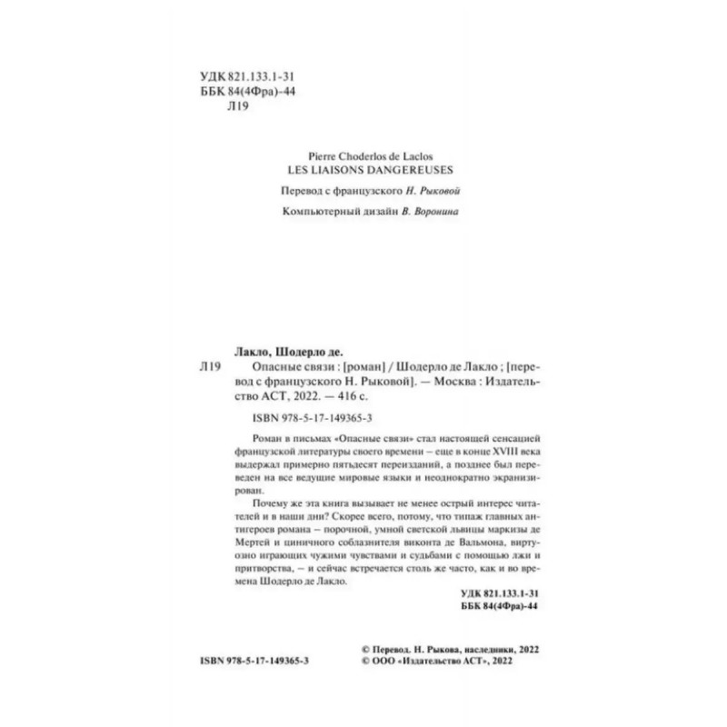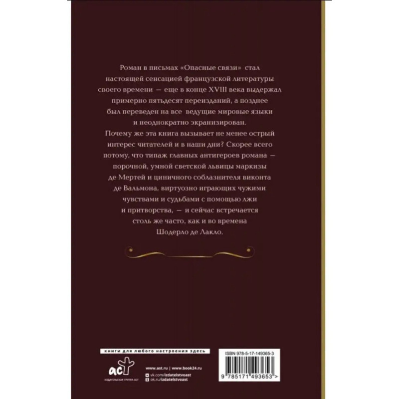 ISBN 9785-1714-93653. Опасные связи. Основанный на реальных событиях эпистолярный роман французского генерала Шодерло де Лакло стал настоящей сенсацией французской литературы своего времени еще в конце XVIII века книга выдержала примерно пятьдесят переизданий, а позднее была переведена на все ведущие мировые языки и неоднократно экранизирована. Роман "Опасные связи" состоит из 175 писем нескольких человек.