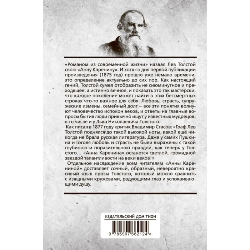 ISBN 9785-90766-2124. Анна Каренина. "Романом из современной жизни" назвал Лев Толстой свою "Анну Каренину". И хотя со дня первой публикации произведения (1875 год) прошло уже немало времени, это определение актуально до сих пор. Как настоящий гений, Толстой сумел отобразить не сиюминутное и преходящее, а истинно вечное, и показать это так мастерски, что каждое поколение может найти в этих бессмертных строках что-то важное для себя. Любовь, страсть, супружеские измены, семейный долг все эти понятия волнуют человечество испокон веков, и ответы на главные вопросы бытия люди привычно ищут у известных мудрецов, в то числе и у Льва Николаевича Толстого. Как писал в 1877 году критик Владимир Стасов: "Граф Лев Толстой поднялся до такой высокой ноты, какой ещё никогда не брала русская литература. Даже у самих Пушкина и Гоголя любовь и страсть не были выражены с такой глубиною и поразительною правдой, как теперь у Толстого "Анна Каренина" останется светлой, громадной звездой талантливости на веки веков!"Отдельное наслаждение всем читателям "Анны Карениной" доставляет сочный, образный, невероятно красивый язык прозы Толстого, который можно сравнить с изящными кружевами, радующими глаз и успокаивающими душу.