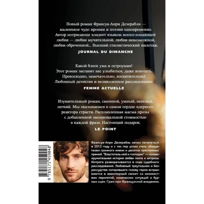 ISBN 9785-17145-9048. Властитель мой и господин. Дезерабль Ф. Франсуа-Анри Дезерабль, автор нашумевшей книги о Ромене Гари "Некий господин Пекельный", начал печататься в 2013 году и с тех пор успел стать обладателем громкого имени и десятка литературных наград. "Властитель мой и господин" головокружительная история любви. Идет судебное расследование. Молодого поэта Васко обвиняют в преступлении на почве страсти. Тетрадь со стихами подследственного служит главной уликой против него. Вся цепочка невероятных событий, начиная с первой встречи влюбленных, мучительный любовный треугольник и безрассудства потерявшего голову Васко складываются в блестящий авантюрный сюжет с множеством перипетий, страданий, сомнений, комических ситуаций и бурных сцен. К делу приобщен даже револьвер, из которого Поль Верлен когда-то стрелял в Рембо. Роман принес Франсуа-Анри Дезераблю Гран-при Французской академии.