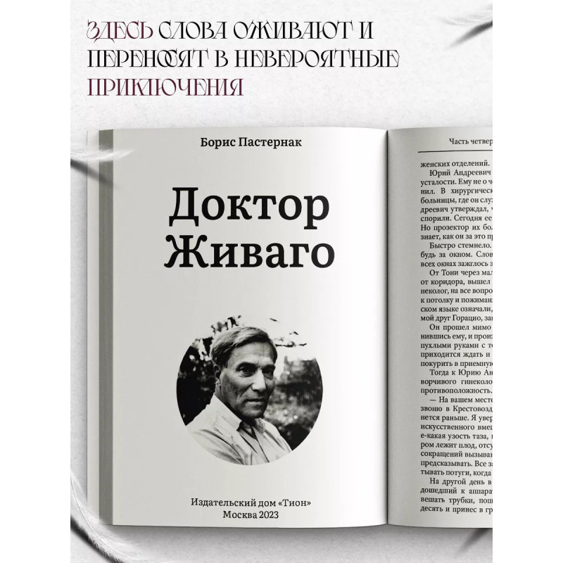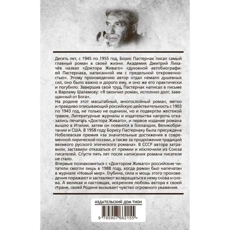 Доктор Живаго. Десять лет, с 1945 по 1955 год, Борис Пастернак писал самый главный роман в своей жизни. Академик Дмитрий Лихачёв назвал "Доктора Живаго" "духовной автобиографией Пастернака, написанной им с предельной откровенностью". Этому произведению автор отдал немало душевных сил, оно было важно и дорого ему, и оно же его практически и погубило. Завершив свой труд, Пастернак написал в письме к Варламу Шаламову: "Я окончил роман, исполнил долг, завещанный от Бога". На родине этот масштабный, многослойный роман, метко и правдиво описывающий российскую действительность с 1903 по 1943 год, не только не оценили, но и подвергли жестокой травле. Литературные журналы и издательства напрочь отказались печатать "Доктора Живаго", и первое издание романа вышло в Италии, затем он появился в Голландии, Великобритании и США. В 1958 году Борису Пастернаку была присуждена Нобелевская премия "за значительные достижения в современной лирической поэзии, а также за продолжение традиций великого русского эпического романа". В СССР автора затравили, заставили отказаться от премии и исключили из Союза писателей. Спустя пять лет после написания романа писателя не стало. Впервые познакомиться с "Доктором Живаго" российские читатели смогли лишь в 1988 году, когда роман был напечатан в журнале "Новый мир". Глубина, сила и мощь этого произведения поражают и заставляют возвращаться к нему снова и снова. А великая и настоящая, искренняя любовь автора к своей стране, своей Родине вызывает чувство огромного уважения.